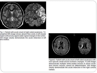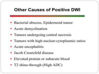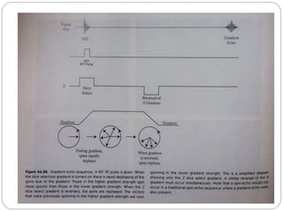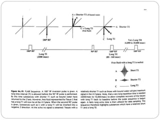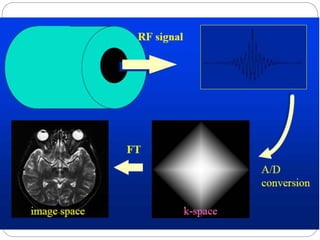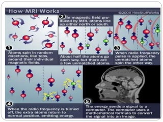 Dr Pawan Kumar presented on MRI principles, techniques, and reading. MRI works by using a strong magnetic field to align proton spins in the body. Radiofrequency pulses excite the protons, causing them to emit signals as they relax back to equilibrium. These signals are used to form MRI images. Key hardware includes magnets, gradient coils, and RF coils. MRI contrast depends on tissue T1 and T2 relaxation times and the chosen TR and TE parameters. Different sequences like T1-weighted, T2-weighted, and FLAIR are used to highlight various tissues and pathologies. Contrast agents can also be used to improve tissue contrast on MRI scans.