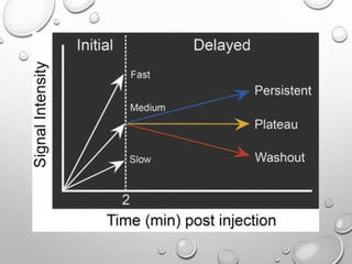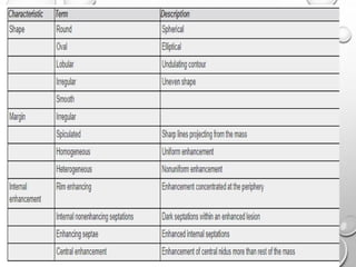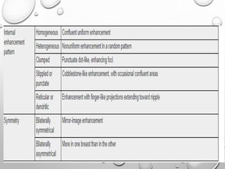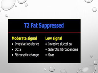 This document discusses breast MRI protocols, techniques, and the interpretation of findings. It provides details on coil and patient positioning, recommended MRI field strength, and standard breast MRI protocols. It discusses recognizing normal enhancing structures like vessels, nipples, and lymph nodes. Guidelines are presented for analyzing lesion enhancement and characterizing benign masses based on criteria like smooth margins, shape, homogeneous enhancement, fat content, T2 signal, and rim enhancement. Examples of benign findings like fibroadenomas and fat-containing lesions are also described.
