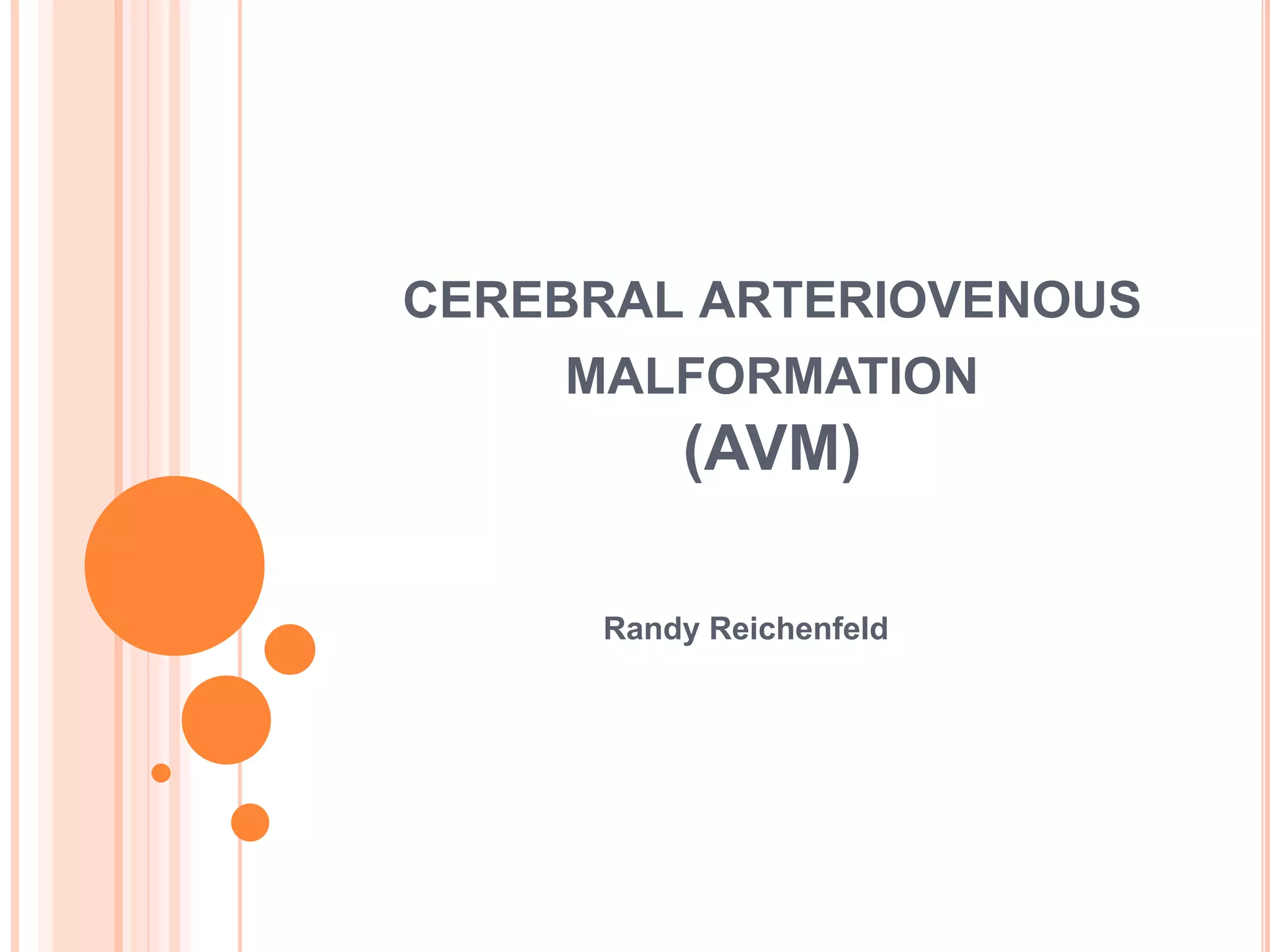 An AVM is an abnormal connection between arteries and veins that allows blood to bypass the capillary bed. AVMs can occur anywhere but are mostly found in the brain and spine. They may be asymptomatic or cause symptoms depending on their location and size. Diagnosis involves imaging tests like CT, MRI, MRA, and DSA. Treatment options include surgery, stereotactic radiosurgery, and endovascular embolization depending on the size, location, and risk profile of the AVM. Complete surgical removal remains the gold standard treatment for lower risk AVMs to eliminate the risk of hemorrhage.