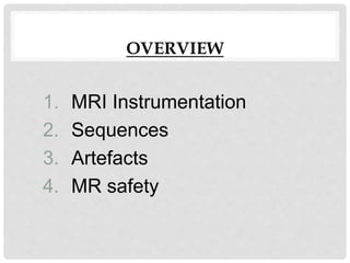 This document provides an overview of MRI instrumentation, sequences, and artifacts. It describes various types of RF coils including surface coils, paired saddle coils, Helmholtz coils, and birdcage coils. It also discusses magnets including permanent magnets, electromagnets, and superconducting magnets. Common MRI sequences such as spin echo, gradient echo, inversion recovery, STIR, fat saturation, proton density, diffusion weighted imaging, and FLAIR are explained.