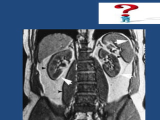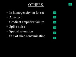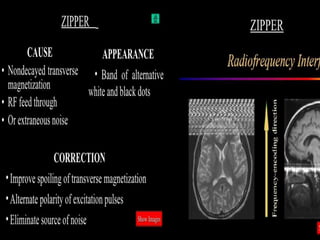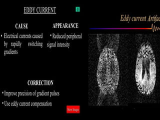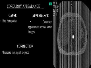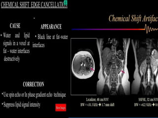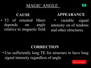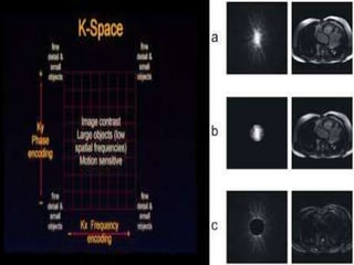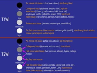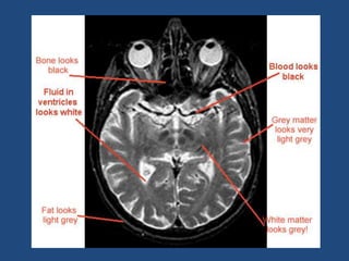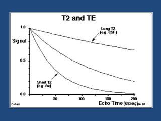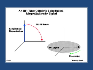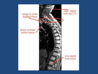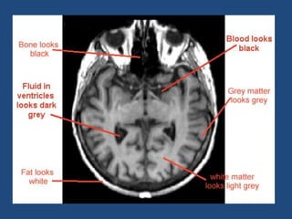 MRI uses strong magnetic fields and radio waves to generate images of the inside of the body. It works by aligning hydrogen atoms in water molecules and fat in tissues when placed in a magnetic field. Radio waves are then used to stimulate the hydrogen atoms, which emit signals as they relax back to their original positions. These signals can be used to construct detailed images of tissues and organs inside the body. The document discusses key concepts in MRI physics including precession, relaxation times T1 and T2, spin echo and gradient echo sequences, and how varying pulse sequence parameters affects contrast in the resulting images.