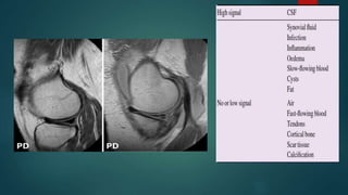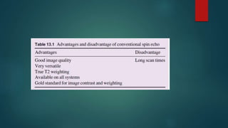 The document discusses magnetic properties relevant to MRI, including magnetic susceptibility, paramagnetism, diamagnetism, and ferromagnetism. It then covers nuclear magnetic resonance and how hydrogen protons are used to generate MRI signals. The basics of MRI signal generation are explained, including precession frequency, longitudinal and transverse magnetization, resonance using radiofrequency pulses, and T1 and T2 relaxation times. T1 relaxation recovers the longitudinal magnetization while T2 relaxation causes transverse magnetization signal decay. Contrast in MRI depends on choosing appropriate repetition and echo times relative to tissue T1 and T2 values.