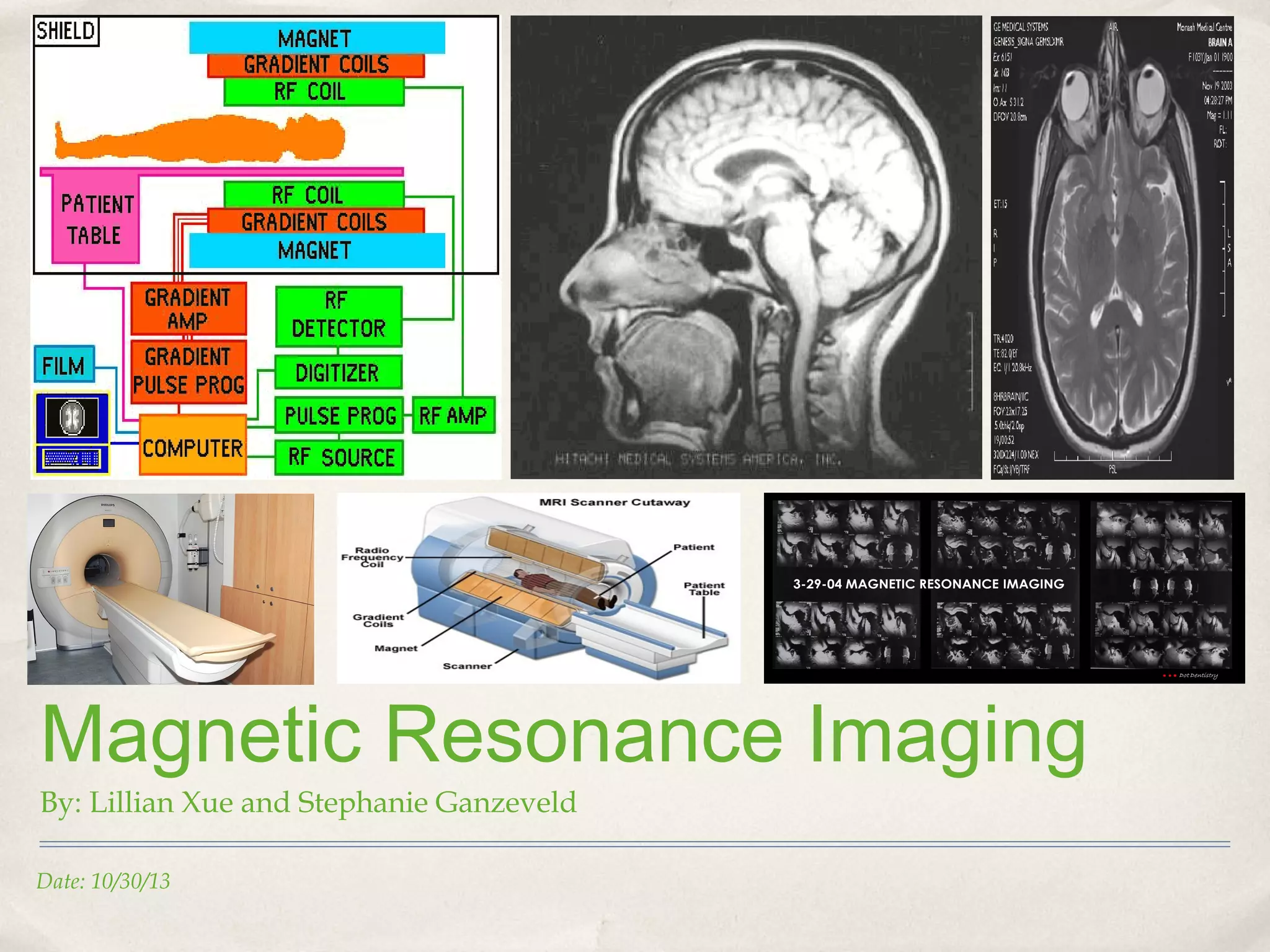Magnetic Resonance Imaging (MRI) is a medical imaging technique that uses strong magnetic fields and radio waves to produce detailed images of the inside of the body. There are different types of MRI machines, including closed, open, and upright configurations. MRI is used to diagnose conditions such as brain tumors, hemorrhages, and multiple sclerosis. It works by aligning hydrogen atoms in the body using magnetism and radio waves, and analyzing the signals produced to form images of tissues and structures. Advantages include a lack of radiation and ability to image soft tissues, while disadvantages include cost and potential incompatibility with metallic implants.