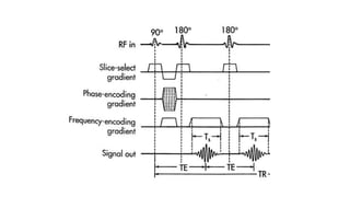 The document discusses MRI pulse sequences and their impact on image quality and contrast. It details the differences between fat and water in terms of T1 and T2 recovery times and how various parameters influence image acquisition. Additionally, it outlines different types of pulse sequences, including spin echo, gradient echo, and inversion recovery, along with their applications in clinical settings.