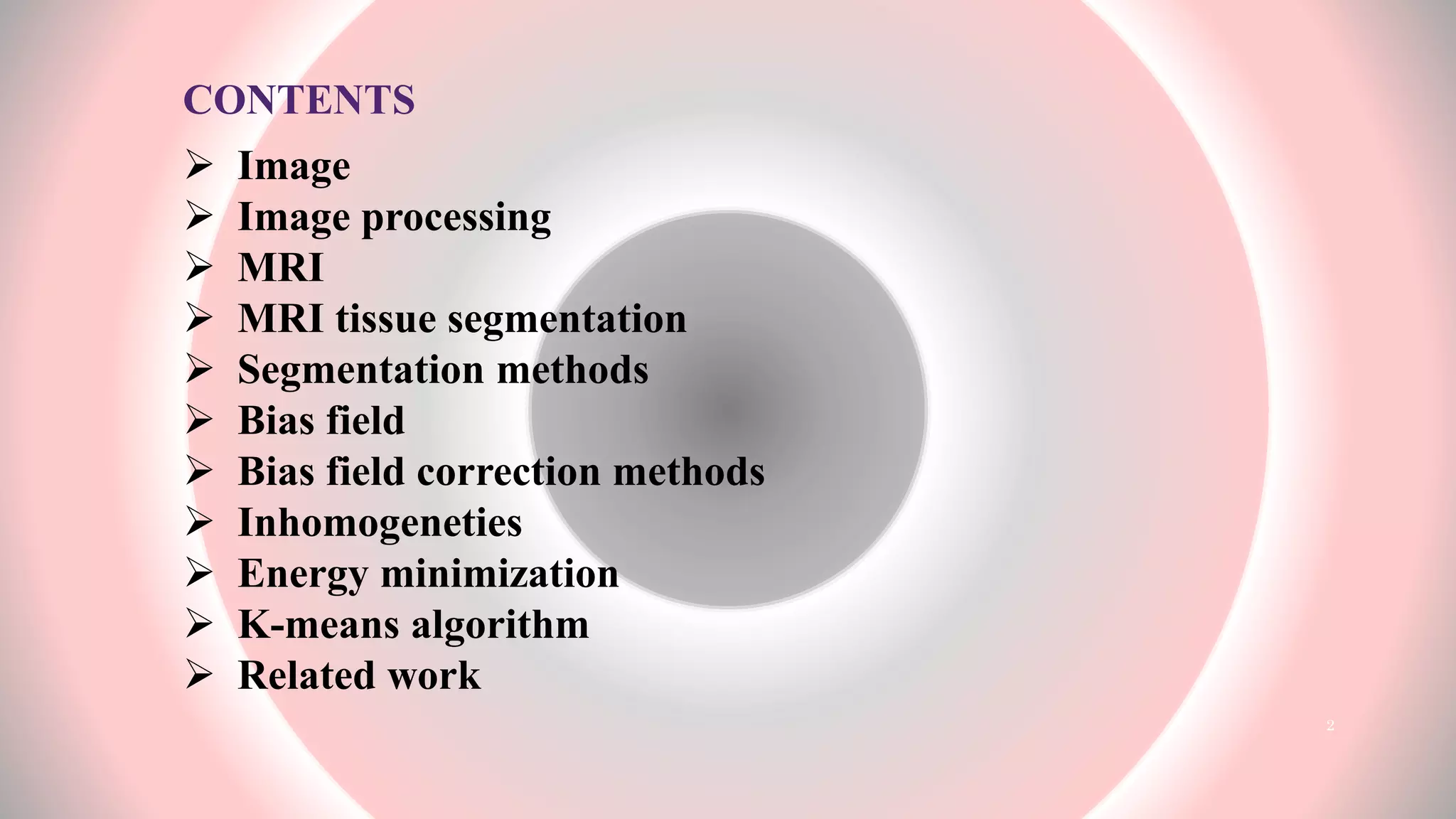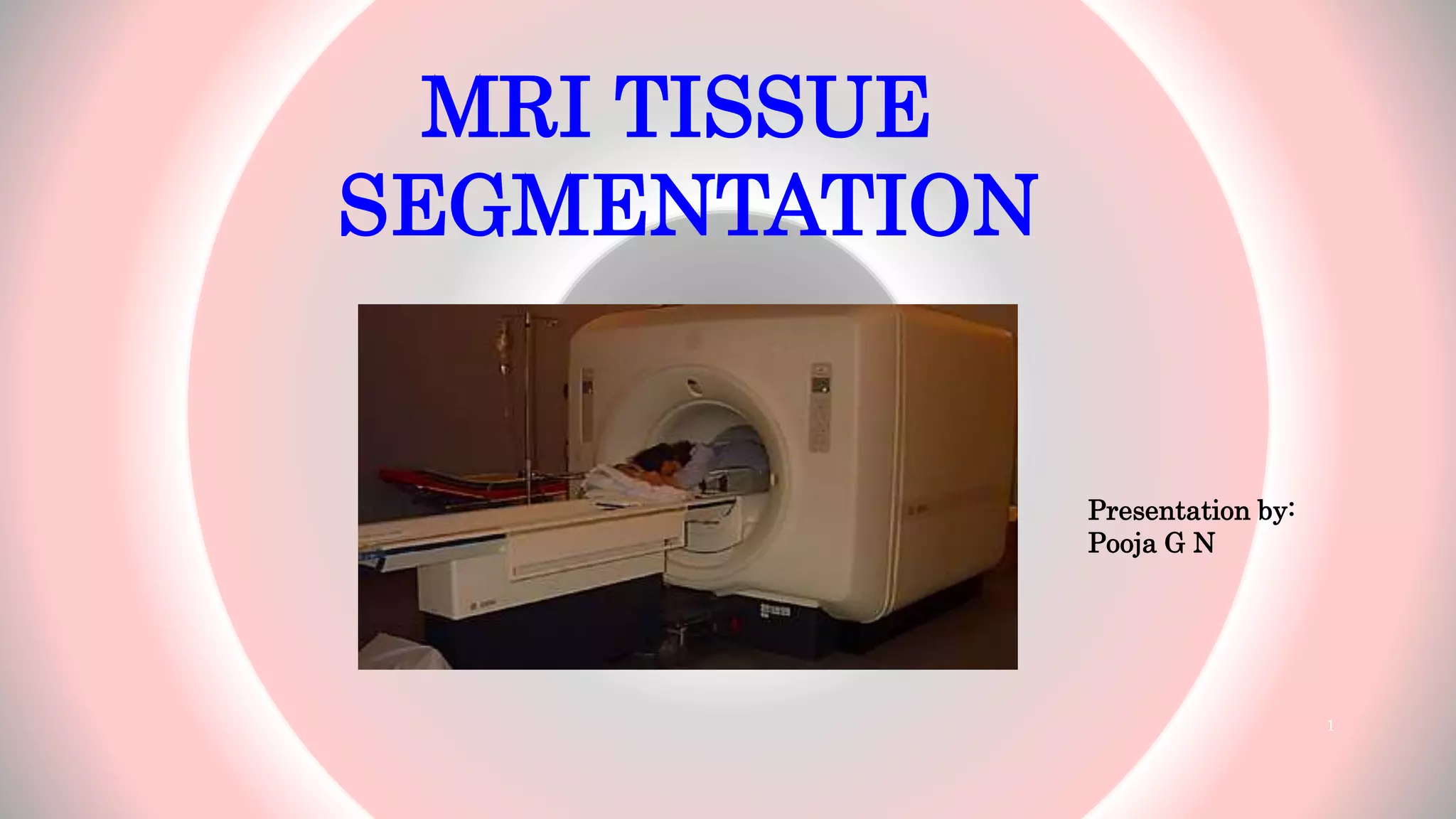 The document presents an overview of MRI tissue segmentation, covering image types, processing applications, and segmentation methods to differentiate normal and abnormal tissues. It discusses the challenges with MRI, including noise, inhomogeneities, and the need for bias field correction in image acquisition. Various algorithms and methods used in MRI tissue segmentation are reviewed, highlighting their development over recent years.