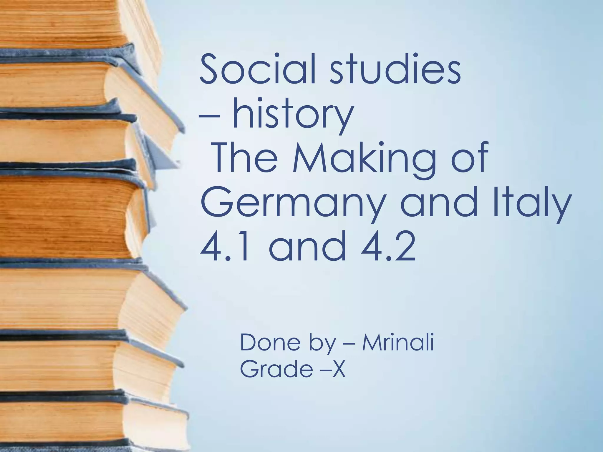 The document summarizes the unification of Germany and Italy in the 19th century. For Germany, Prussia took the lead in unifying the German states through three wars over seven years, culminating in the Prussian king being proclaimed German Emperor in 1871. For Italy, the country was divided among several states in the mid-19th century. Through the efforts of figures like Cavour and Garibaldi, and with the support of France, Italy was unified with Victor Emmanuel II as its king by 1861. However, nationalist ideas had not fully spread and many Italians remained unaware of the concept of a unified Italian nation.