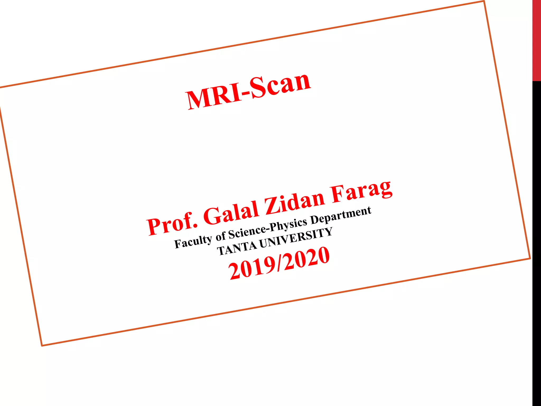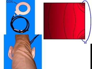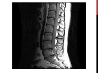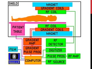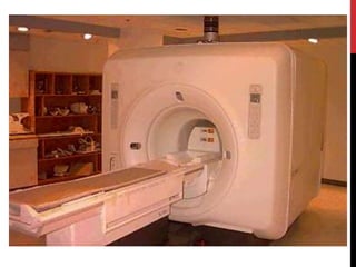 Magnetic resonance imaging (MRI) is a medical imaging technique that uses strong magnetic fields and radio waves to produce detailed images of the inside of the body. MRI is based on nuclear magnetic resonance, which uses magnetic fields to detect atomic nuclei within tissues from different angles in order to form cross-sectional images of internal structures. The document discusses the physics principles behind MRI, including how hydrogen protons are aligned by magnetic fields and how their signal can be localized to different regions of the body. It also covers differences between T1-weighted and T2-weighted MRI sequences, common artifacts that can appear on images, and advantages and risks of MRI compared to other imaging techniques like X-ray and CT scans.