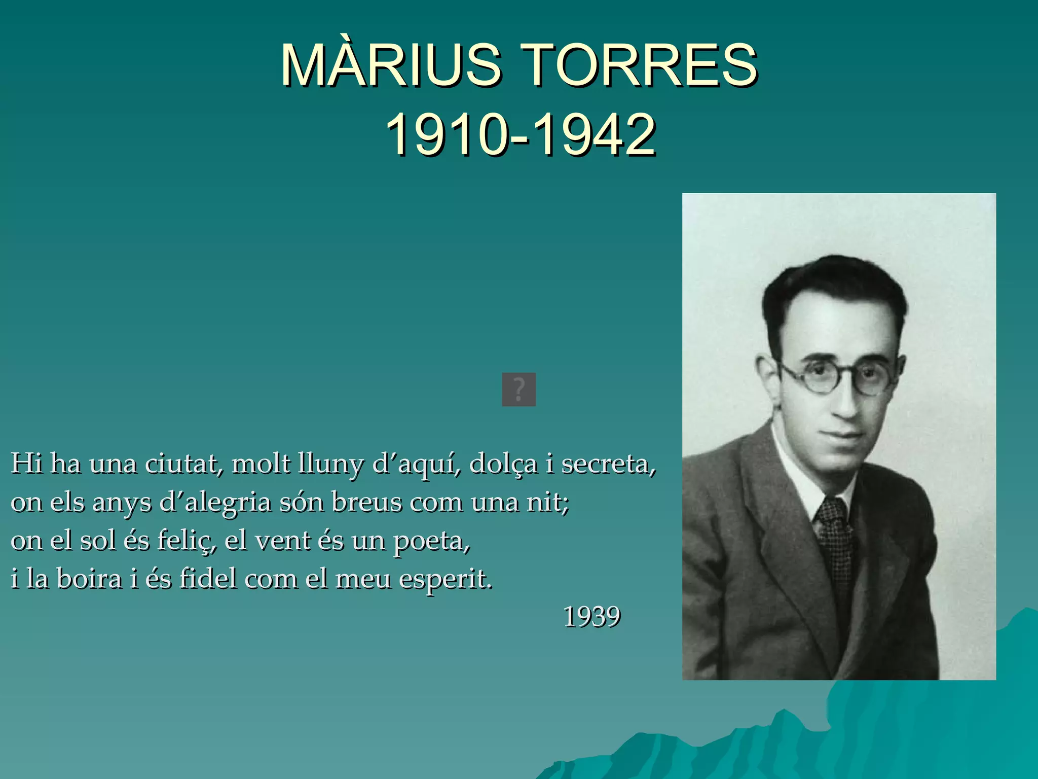MÀRIUS TORRES 1910-1942Hi ha una ciutat, molt lluny d’aquí, dolça i secreta, on els anys d’alegria són breus com una nit; on el sol és feliç, el vent és un poeta, i la boira i és fidel com el meu esperit. 1939
