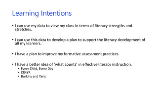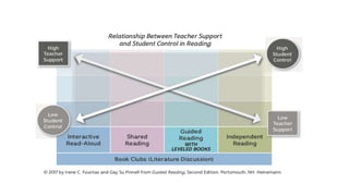 The document discusses strategies for evidence-guided literacy instruction aimed at closing learning gaps for K-4 students. It emphasizes the importance of data in identifying literacy strengths and weaknesses, developing formative assessment practices, and implementing effective teaching plans. Key concepts include the relationship between teacher support and student control, as well as the need for tailored reading contexts to enhance comprehension and communication skills.