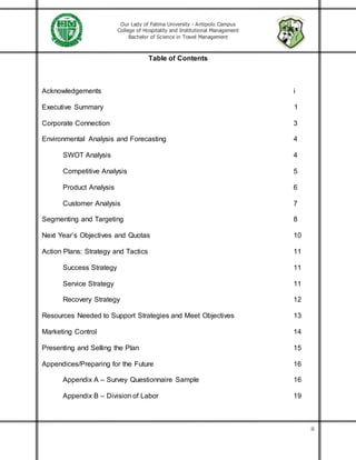 The document acknowledges those who supported the marketing plan project. It thanks God, the project supervisor, Our Lady of Fatima University for the courses taken, and families and friends for their support and understanding. An opportunity was given to learn about sustainable tourism and developing tourist goods and services. The document also contains an executive summary, SWOT analysis, competitive analysis, product and customer analyses, segmentation and targeting, objectives and quotas, action plans, strategies, resources needed, and appendices with a survey sample and division of labor.