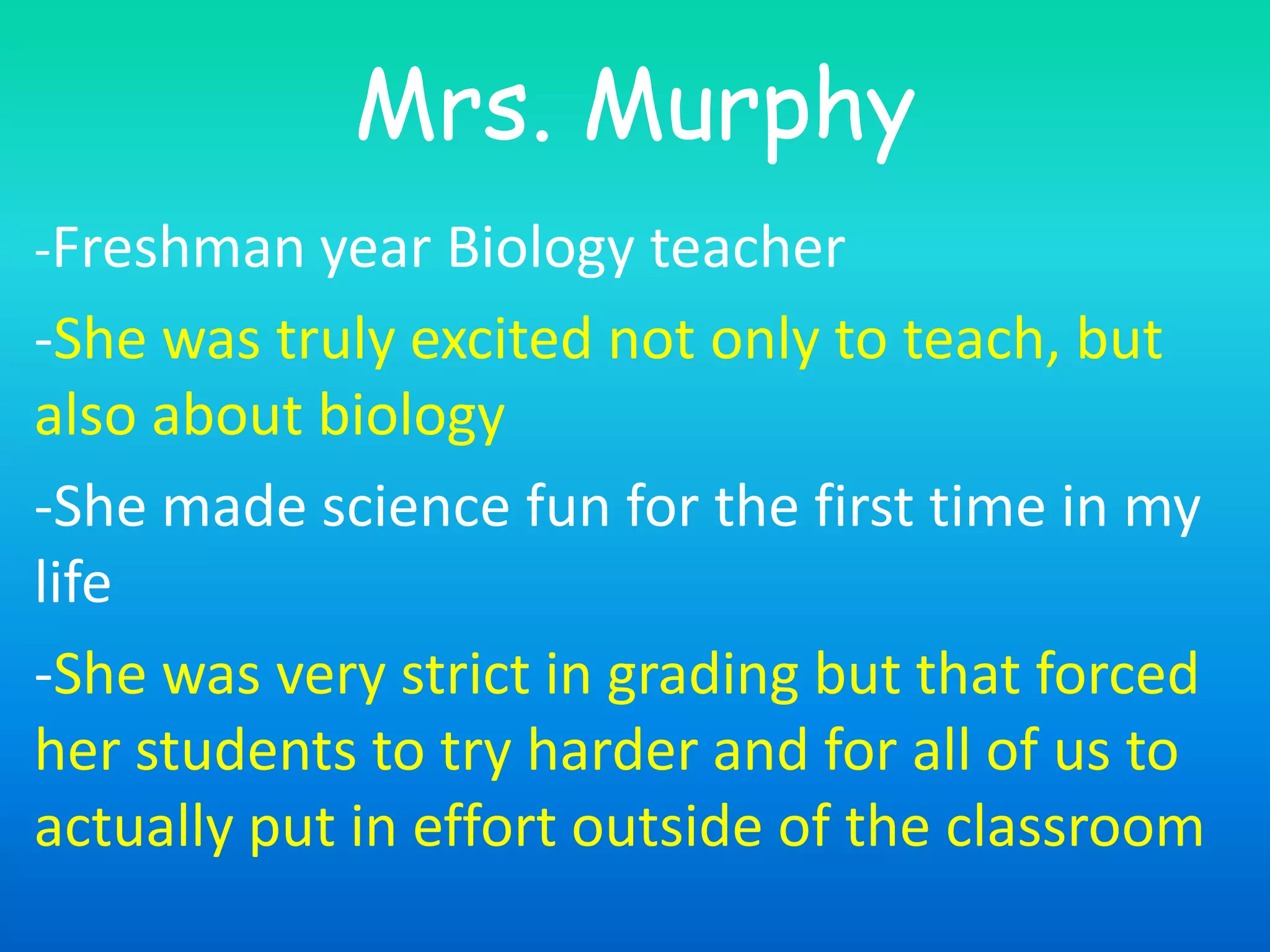 Mrs. Murphy was a freshman year Biology teacher who was excited both to teach and about biology, she made science fun for the first time in the student's life by being very strict in grading which forced her students to try harder and put in more effort outside of the classroom.
