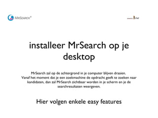 installeer MrSearch opje desktop MrSearch zal op de achtergrond in je computer blijven draaien. Vanaf het moment dat je een zoekmachine de opdracht geeft te zoeken naar kandidaten, dan zal MrSearch zichtbaar worden in je scherm en je de searchresultaten weergeven. Hier volgen enkele easy features