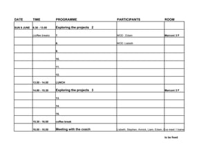 This document outlines the schedule for a multi-day training programme taking place from June 5-7. The programme includes sessions on exploring projects, meetings with coaches, and a concluding lunch. Most sessions involve all participants and take place in room Marconi 3F, with breaks included. Individual meetings with coaches are also scheduled for each day in various rooms. On the evening of June 5th, an aperitif is planned at a nearby location.