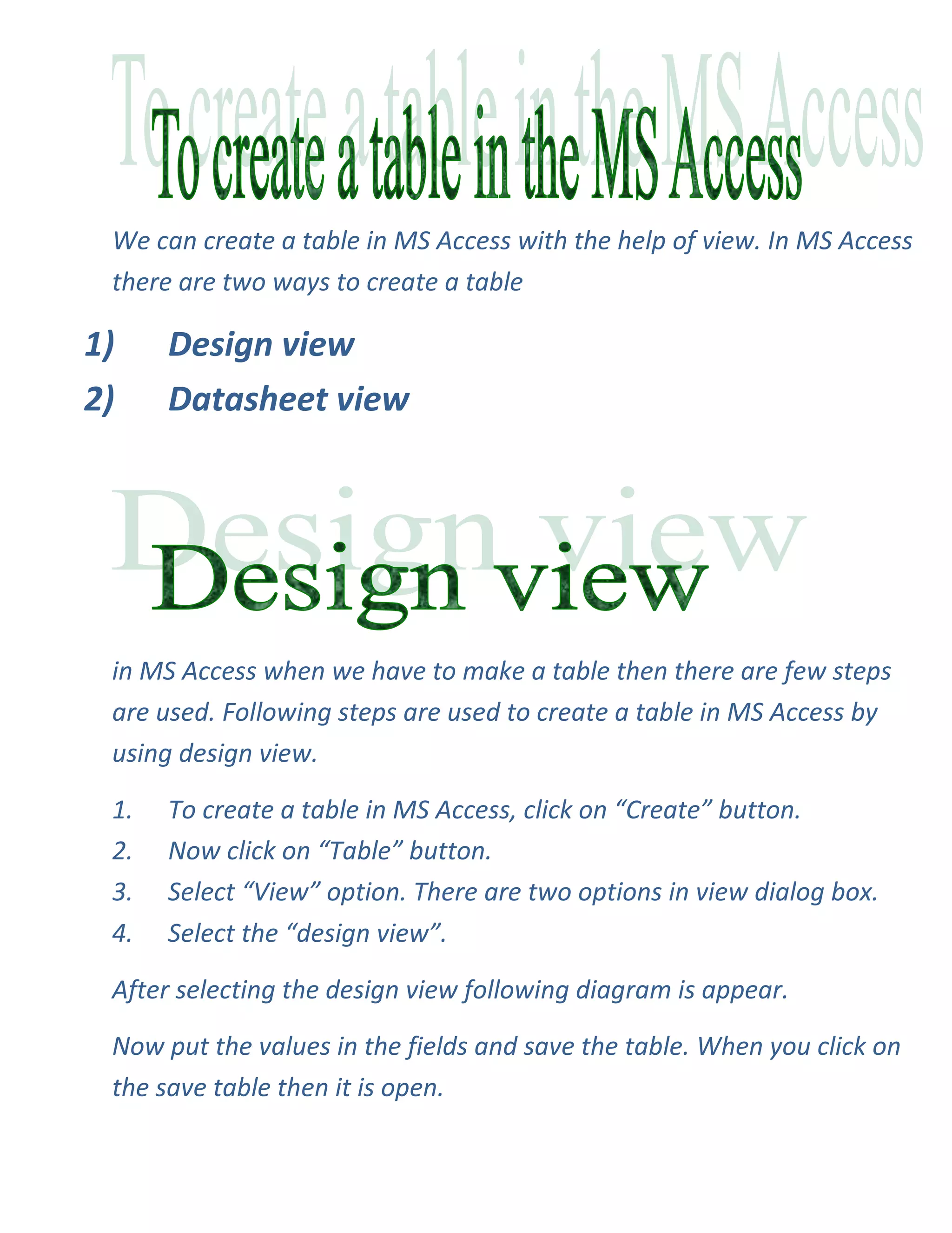 The document discusses various ways to create tables and queries in Microsoft Access. It describes the design view and datasheet view for creating tables, as well as the steps to create relationships between tables. It also outlines the different types of queries that can be created in Access, including select, update, and make table queries, and provides the steps to design each type of query.