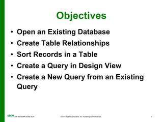 The document covers objectives and instructions for using queries in Microsoft Access 2010 to sort, filter, and analyze data from one or multiple tables. Key points covered include creating relationships between tables, sorting records, designing queries using criteria, calculations, grouping, and statistics to summarize data in a compact crosstab view. The overall goal is to teach how to extract and manipulate specific data through queries to answer questions about the information in a database.