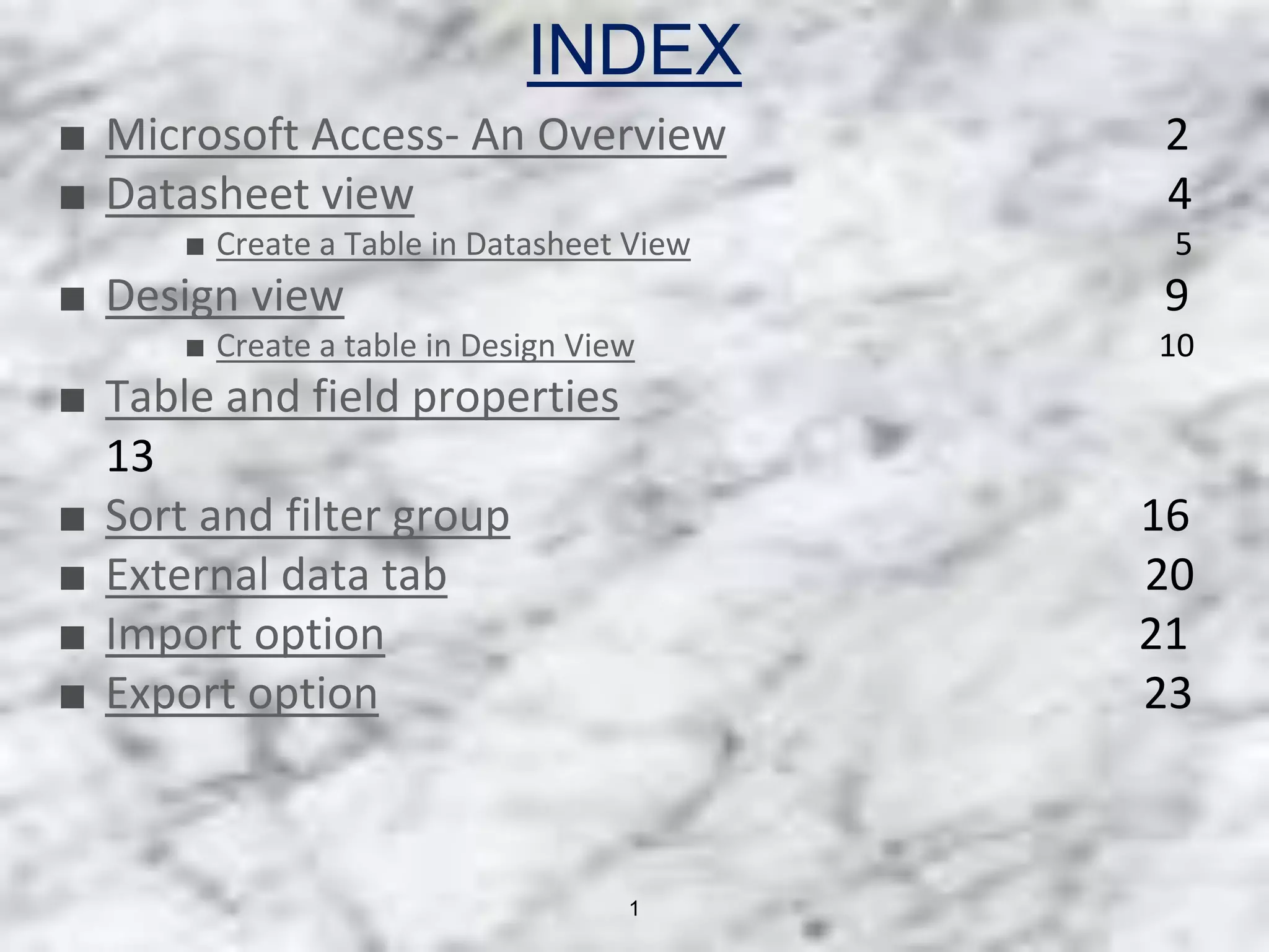 This document provides an overview of the Home tab and External Data tab in Microsoft Access. It discusses datasheet view and how to create and modify tables in both datasheet and design view. It also covers sorting and filtering data, and explains the import and export options available in the External Data tab such as importing data from text files or exporting to Excel or SharePoint.