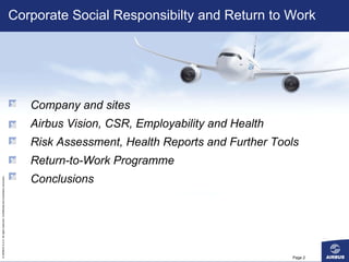 The document outlines Airbus's commitment to corporate social responsibility, employee health management, and a return-to-work program designed to facilitate the rehabilitation of employees after long-term illness. It provides statistics on health trends and the effectiveness of rehabilitation initiatives, highlighting improved performance and reduced absence from work. The program emphasizes ergonomic workplace design and close collaboration among various stakeholders to ensure successful employee reintegration.