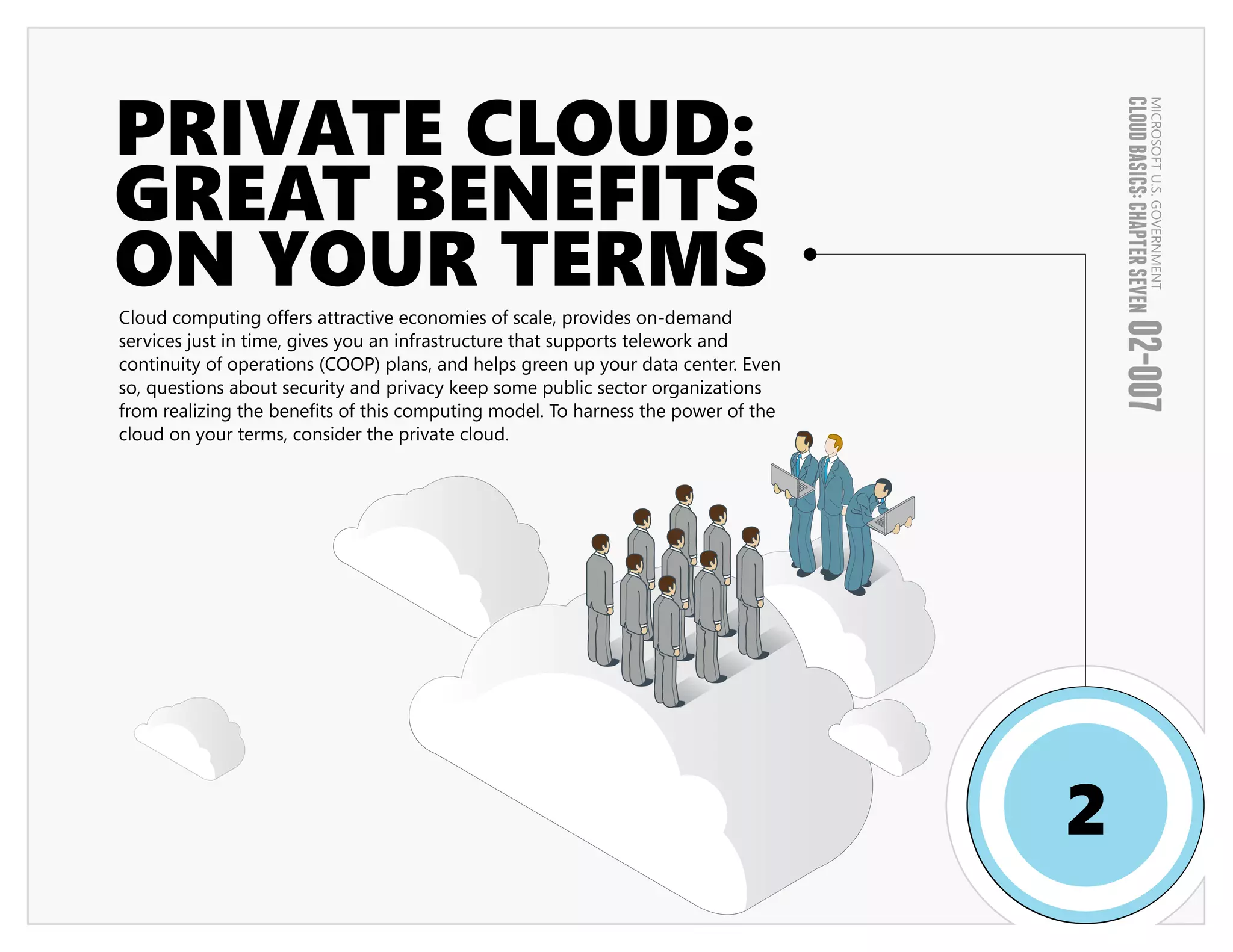 The document discusses private clouds and their benefits for government organizations. A private cloud provides dedicated cloud resources either on-premises or hosted remotely, allowing more control over security, customization, and governance than a public cloud. A private cloud can help optimize existing server capacity, increase data center efficiency, and provide consistent services. When comparing private cloud providers, an organization should consider attributes like security, management capabilities, storage options, supported services, and customer support. A private cloud can help agencies lower costs while supporting initiatives like data center consolidation, telework support, and greener computing.
