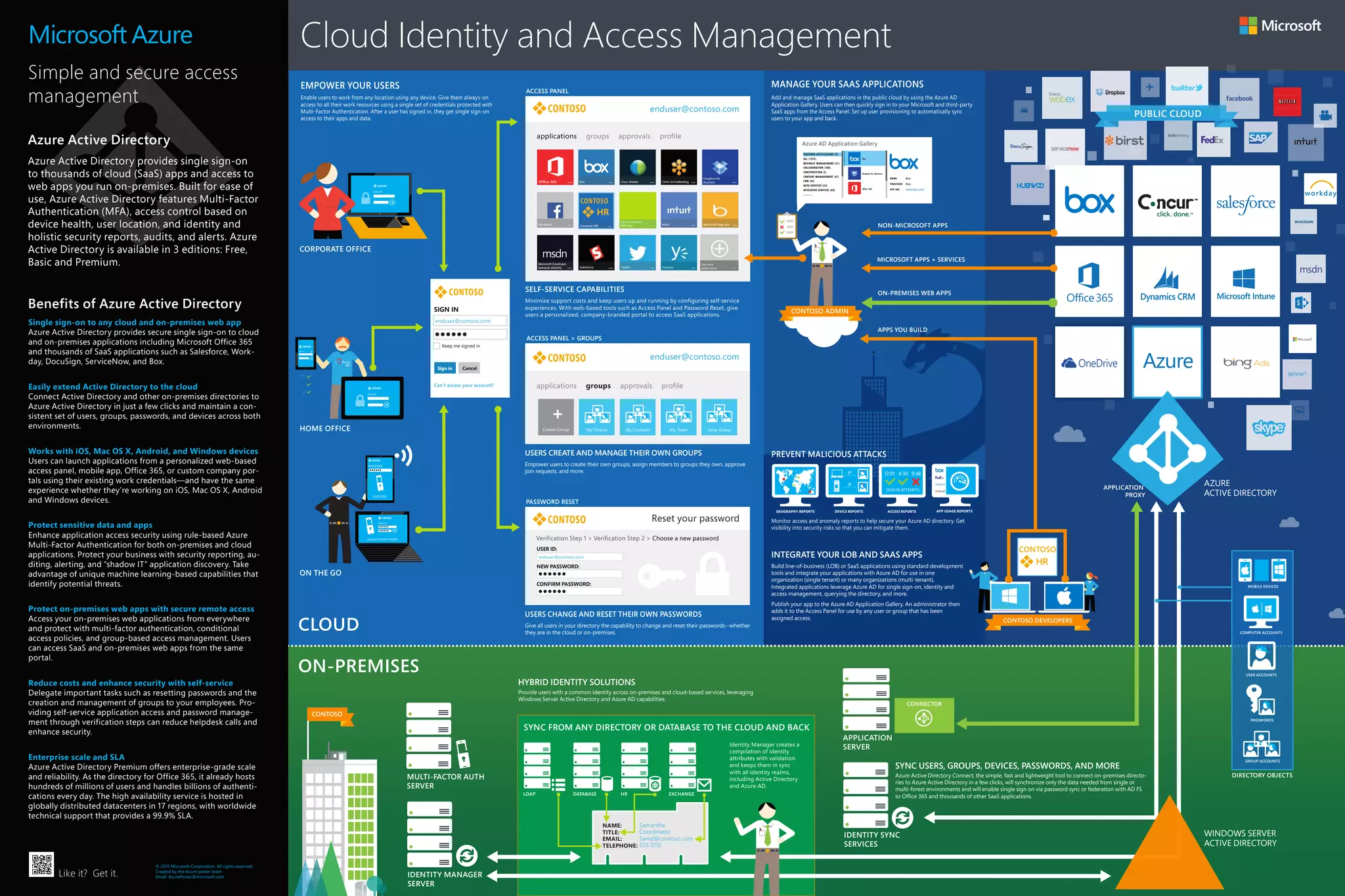 Azure Active Directory provides single sign-on access to thousands of cloud and on-premises applications with features like multi-factor authentication and conditional access policies. It enables connecting on-premises directories to the cloud while maintaining consistent user access and synchronization. Users can access applications from any device using their work credentials. Azure Active Directory also offers self-service capabilities, application management, identity synchronization tools, and security reporting functionality.