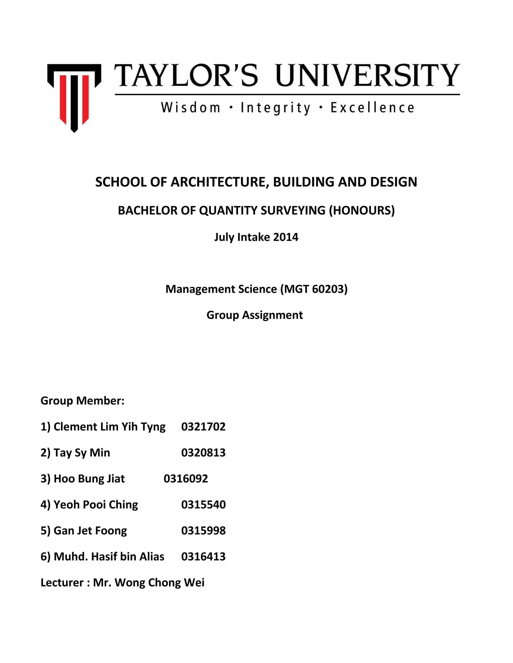 This document provides information about a group assignment for a management science course. It includes the group member names, a table of contents, and details about the company profile, vision/mission statements, goals, organization chart, and job scopes of WCW Construction Company. The company was established in 2011 and aims to achieve a high reputation in the construction industry through professional standards and customer satisfaction. It lays out short, mid, and long term goals and describes the roles and responsibilities of director, managers, supervisors, and other positions.