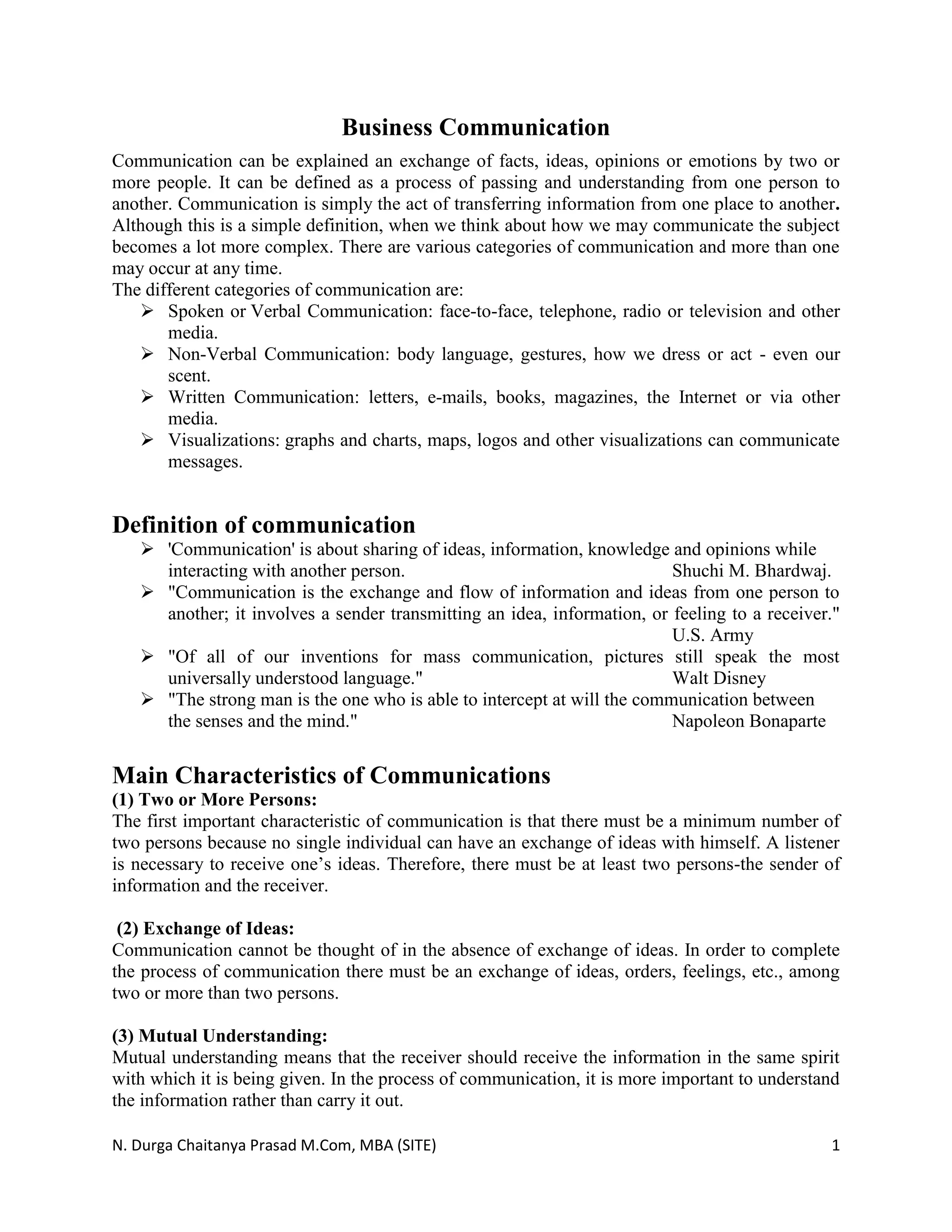 The document discusses communication and provides definitions and categories of communication. It defines communication as the exchange of information between two or more people and discusses various types of communication including verbal, non-verbal, written, and visual. It also outlines key characteristics of communication such as the need for at least two people, the exchange of ideas, mutual understanding, and being an ongoing process. The document then discusses models of the communication process and potential barriers to effective communication such as semantic, psychological, organizational, and personal barriers.