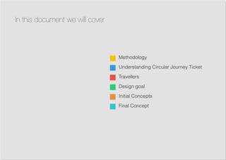 This document outlines the design process for an online application to book Circular Journey Tickets with Indian Railways. It begins with research on the existing ticket booking process and an analysis of user needs. Various initial concepts are presented, focusing on intuitive booking workflows. The final design concept displays a clean interface for searching routes and trains, viewing trip summaries, and completing bookings in multiple steps. Additional features like maps, event information, and reviews are included to enhance the user experience. The proposed online system aims to streamline Circular Journey Ticket booking and make the process more accessible.