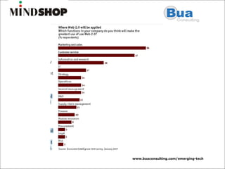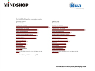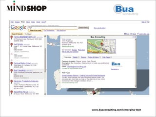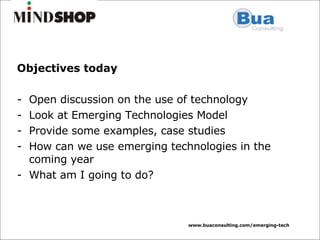 The document discusses emerging technologies and how businesses can leverage them. It provides examples of technologies like web 2.0, cloud computing, mashups and how companies have used them. Case studies are presented on using tools like Google Apps, Skype, Central Desktop and data from websites to improve business processes and deliver better services. The presentation encourages attendees to develop a one page plan to apply emerging technologies to address three business issues.