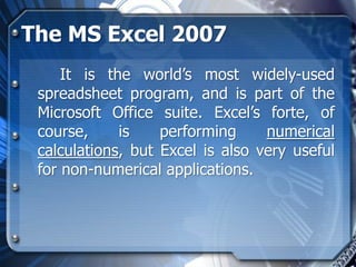 Microsoft Excel 2007 is a widely used spreadsheet program that is part of the Microsoft Office suite, with capabilities for performing calculations, organizing data, creating charts and graphics, and automating tasks through macros. Excel allows users to enter and manipulate data in worksheets and perform calculations with formulas, analyze information with built-in functions and tools, and visualize data through a variety of chart types. Key features and functions of Excel 2007 include entering and editing data, working with formulas and functions, formatting worksheets, inserting objects and illustrations, printing and preparing files, reviewing and sharing workbooks, and customizing the Excel environment.