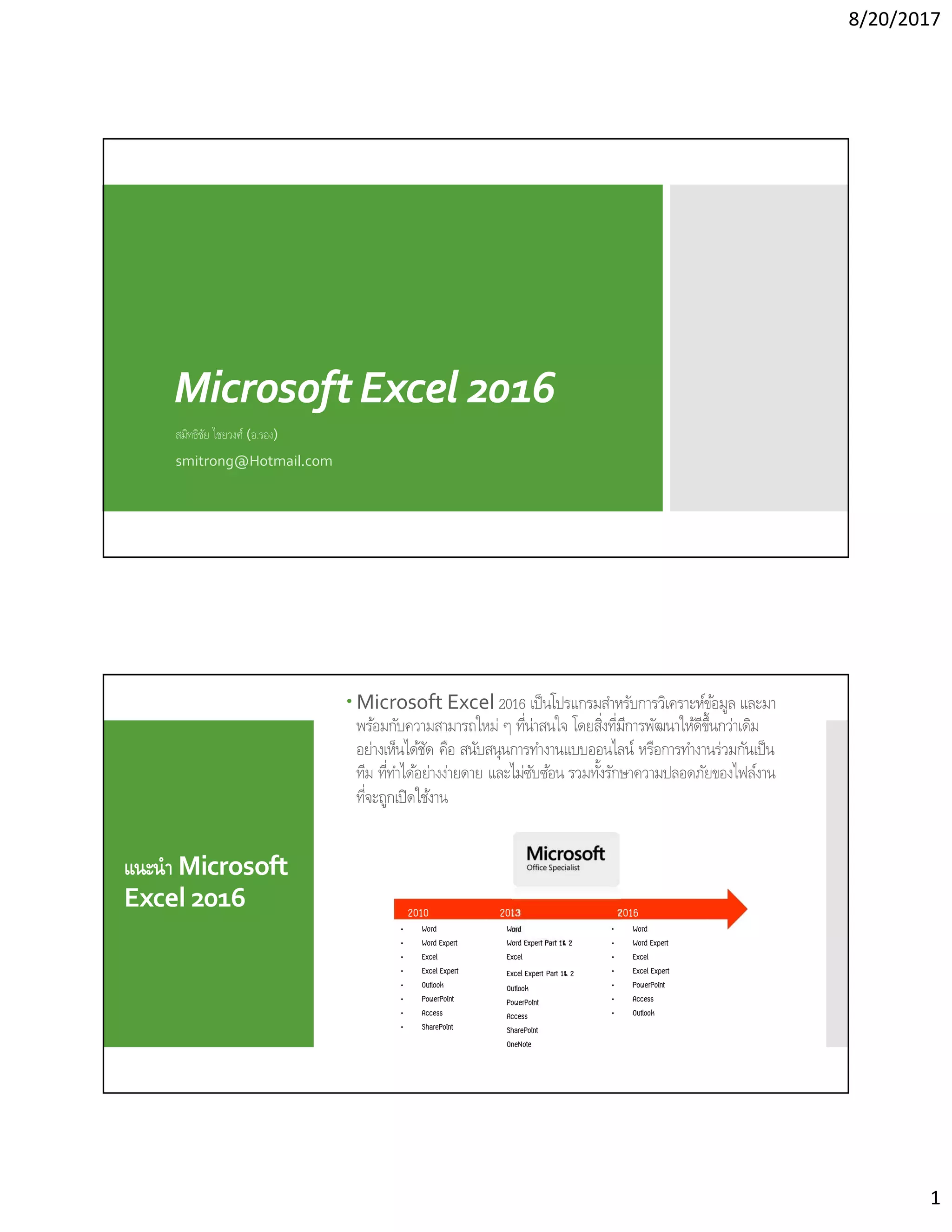 ไชยวงศ์ (อ.รอง) smitrong@Hotmail.com แนะนํา Microsoft Excel 2016 Microsoft Excel 2016 เป็นโปรแกรมสําหรับการวิเคราะห์ข้อมูล และมา พร้อมกับความสามารถใหม่ ๆ ทีน่าสนใจ โดยสิงทีมีการพัฒนาให้ดีขึนกว่าเดิม อย่างเห็นได้ชัด คือ สนับสนุนการทํางานแบบออนไลน์ หรือการทํางานร่วมกันเป็น ทีม ทีทําได้อย่างง่ายดาย และไม่ซับซ้อน รวมทังรักษาความปลอดภัยของไฟล์งาน ทีจะถูกเปิดใช้งาน 2016 • Word • Word Expert • Excel • Excel Expert • PowerPoint • Access • Outlook 2010 • Word • Word Expert • Excel • Excel Expert • Outlook • PowerPoint • Access • SharePoint 2013 Word Word Expert Part 1& 2 Excel Excel Expert Part 1& 2 Outlook PowerPoint Access SharePoint OneNote