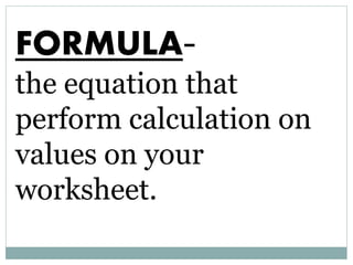 This document discusses how to create formulas in Microsoft Excel. It explains that a formula is an equation that performs calculations on values in a worksheet. The parts of a formula include the equal sign, functions, cell references, operators, constants, values, and parentheses. It describes each part and their purpose. The order of operations for formulas is also covered, noting that Excel evaluates exponents first, then multiplication/division from left to right, and finally addition/subtraction.