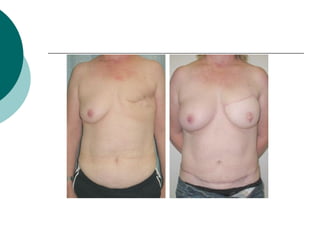 The document discusses breast reconstruction options for women with breast cancer. It outlines the key decisions around mastectomy versus breast conservation, immediate versus delayed reconstruction, and types of reconstruction including autologous techniques using the patient's own tissue or implants/expanders. Reasons for reconstructing the conserved breast are also reviewed, such as achieving symmetry or correcting shape/nipple issues. Patient factors, tumor characteristics, treatment plans, and lifestyle/expectations must all be considered in personalized decision making around reconstruction.