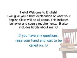 This document provides an overview of Ms. Julia's English class. It introduces Ms. Julia, outlines expectations for student behavior which includes being on time, prepared, and respectful. It also details course requirements such as bringing required materials to class, completing assignments on time with labels, and policies around cell phone use and food. The grading system is explained which is based on participation, assignments, projects and exams. Ms. Julia pledges to respect students and help them meet learning goals.