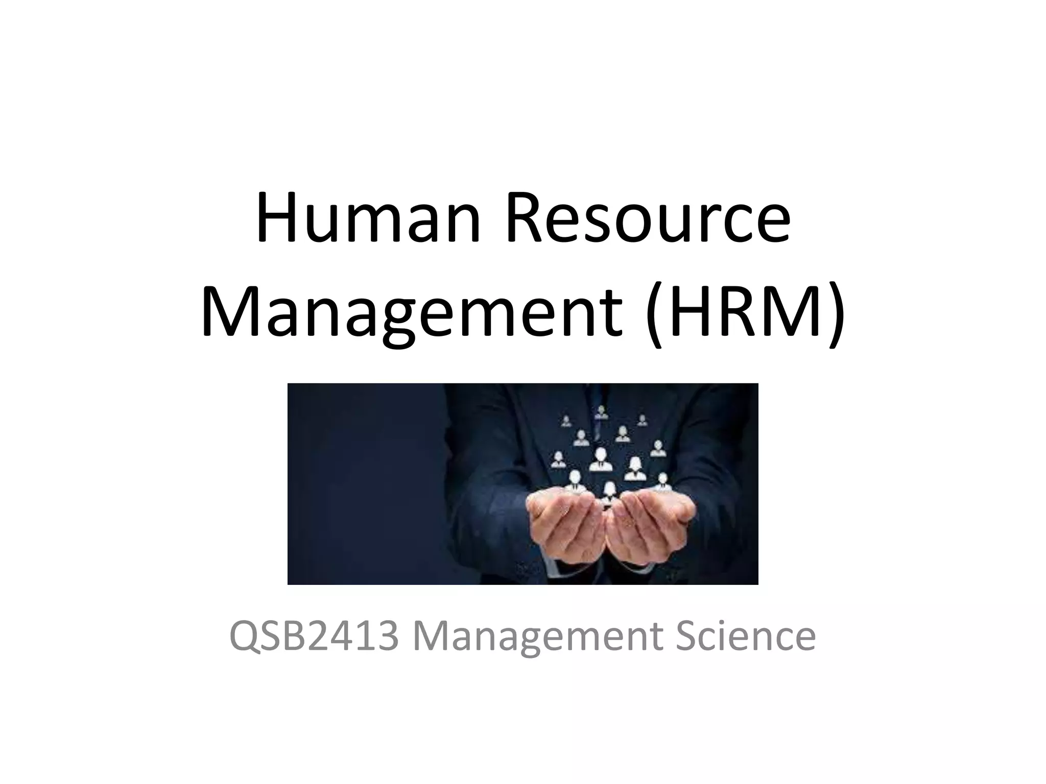 The document discusses the key aspects of human resource management (HRM) including analyzing jobs, forecasting human resource needs, recruiting and selecting the right candidates, training employees, appraising performance, and rewarding employees. It describes the challenges in selecting candidates and ensuring a good fit with organizational culture. The goal of HRM processes is to hire and develop employees with the necessary skills to achieve organizational strategies and goals.