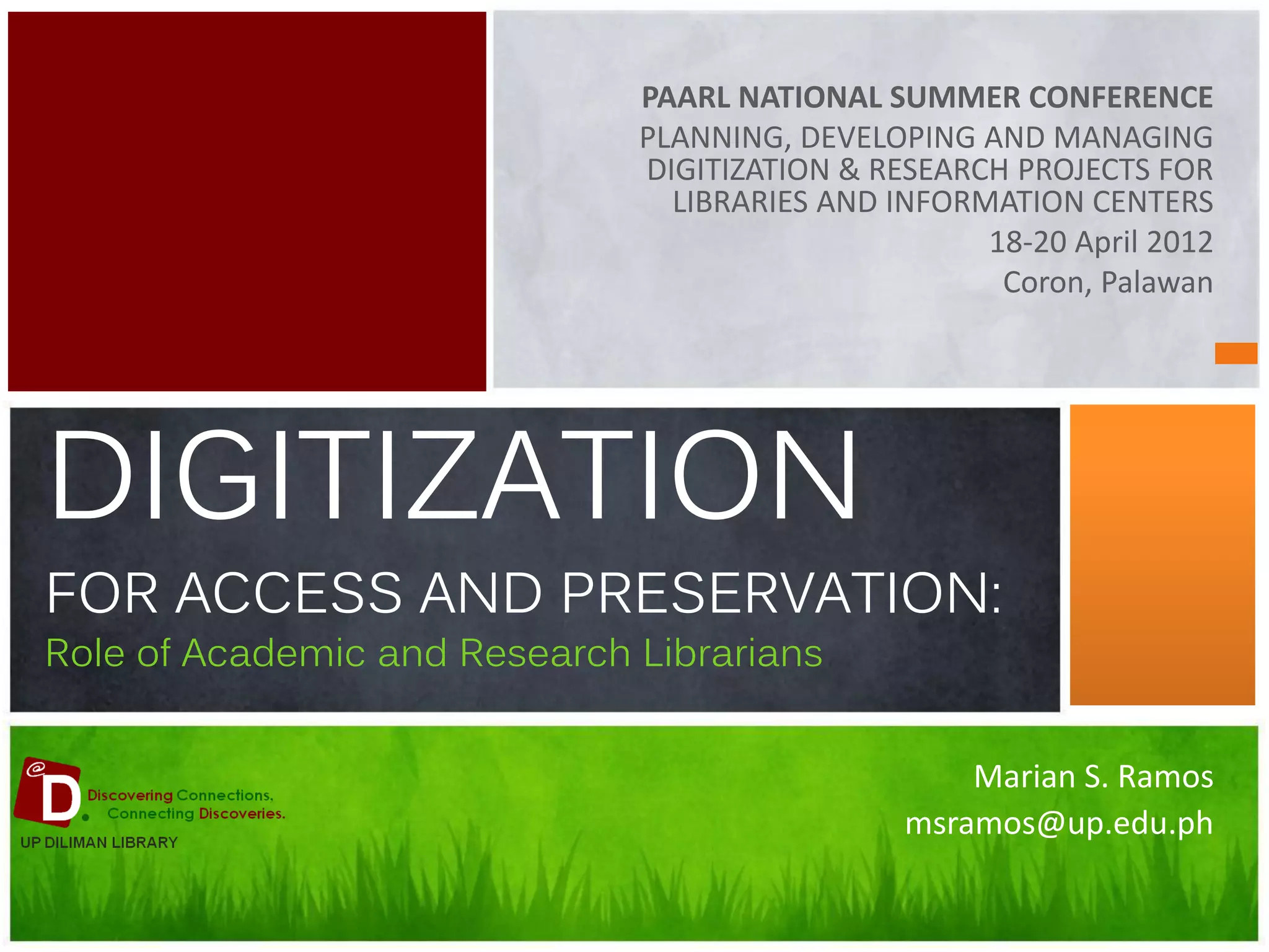 This document discusses digitization and the role of librarians in digitization projects. It begins with an introduction to digitization, including definitions and the digitization process. It then covers topics such as digitization for preservation and access, challenges of digitization, and the responsibilities of librarians in digitization projects. The document provides an overview of key issues in planning and managing library digitization initiatives.