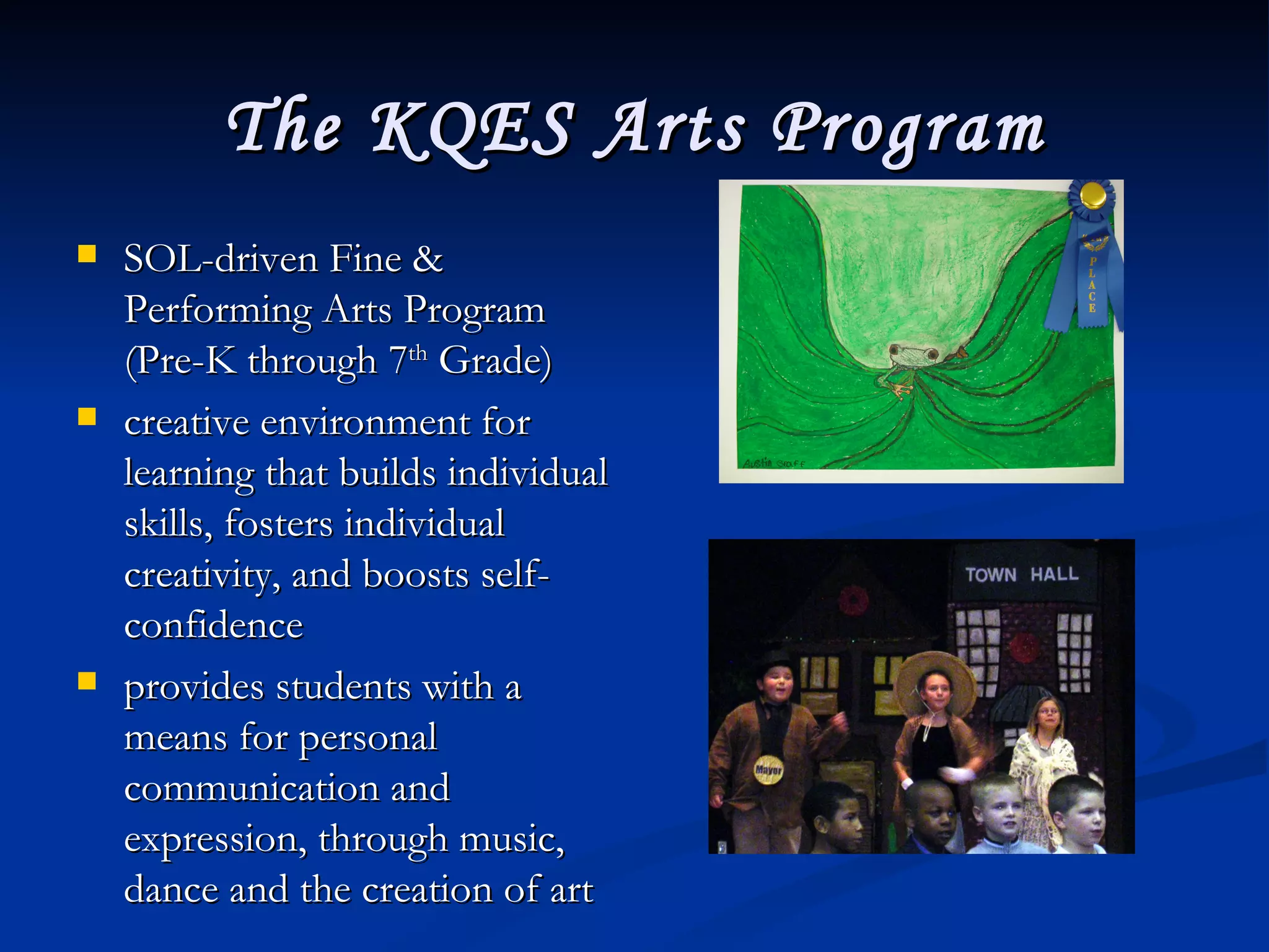 The KQES Arts Program provides a creative environment for students in pre-K through 7th grade to learn fine arts and performing arts. The program includes music, dance, and art lessons that are based on Virginia SOLs. It aims to develop students' skills, foster creativity, and boost confidence. Students have opportunities to express themselves through the arts, learn about different cultures, and showcase their work within the school and local community.