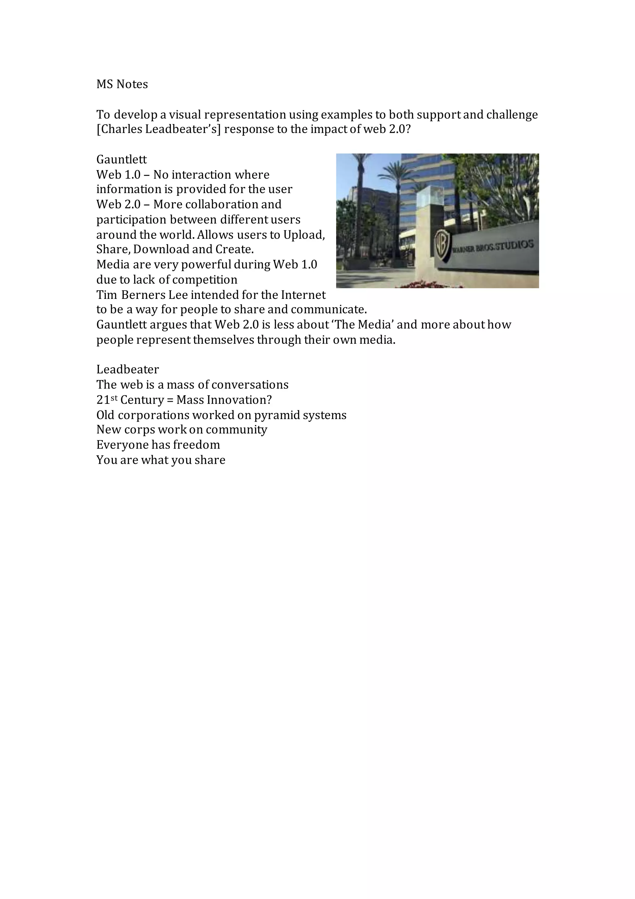 Web 1.0 provided static information to users with no interaction, while Web 2.0 enables more collaboration and participation as it allows users to upload, share, download and create content. The document discusses how Gauntlett argues that Web 2.0 is less about traditional media and more about how individuals represent themselves through user-generated media, challenging Charles Leadbeater's views on the impact of Web 2.0. It also notes how Tim Berners-Lee intended the Internet to enable sharing and communication between users.