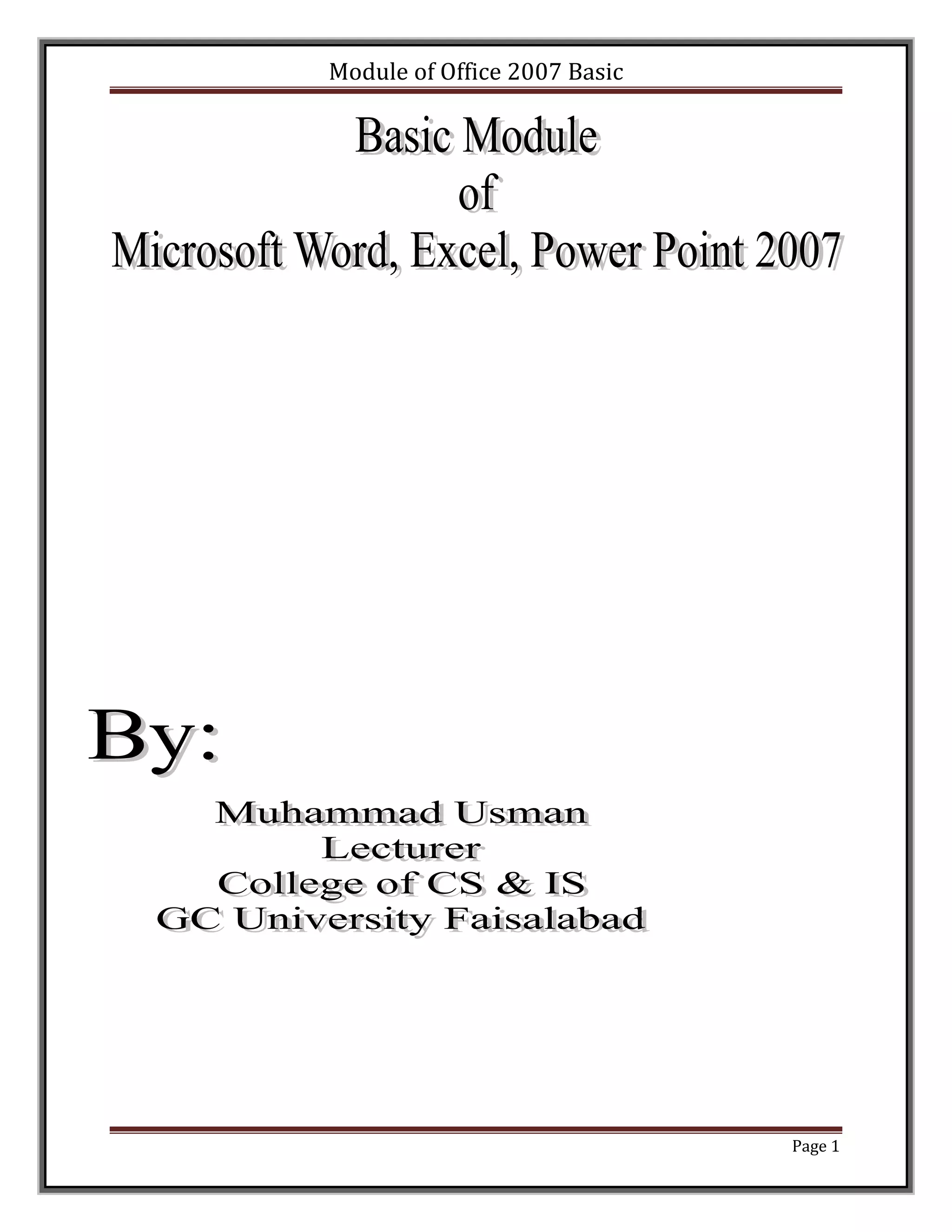 This document provides an overview of the Microsoft Word 2007 interface and basic functions. It describes the main components of the Word window, including the Microsoft Office Button, Quick Access Toolbar, Title Bar, Ribbon, Ruler, Text Area, Scroll Bars, and Status Bar. It then outlines 5 lessons that will teach basic Word tasks like typing, formatting, inserting images and tables, working with styles, adding bullets and numbers, page layout, and printing. The lessons provide step-by-step instructions to learn key Word features and functions.