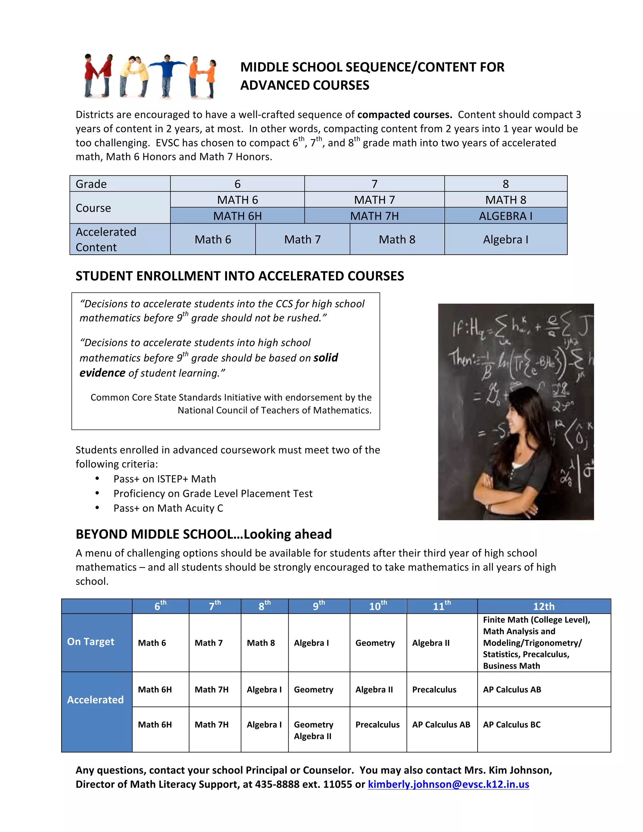 The document outlines the middle school math sequence and requirements for enrollment in accelerated courses for a school district. It recommends compacting 3 years of math content into 2 years maximum. The district has chosen to offer Math 6 Honors and Math 7 Honors to compact 6th, 7th, and 8th grade math into two years. Students must meet two of the following criteria to enroll: passing the state math exam, proficiency on a placement test, or passing a separate math assessment. The document also discusses course options after middle school through high school graduation.