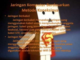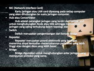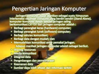 Dokumen tersebut membahas tentang internet dan intranet, mencakup pengertian, sejarah, komponen, manfaat, dan dampaknya. Internet dijelaskan sebagai jaringan komputer global untuk berkomunikasi dan bertukar informasi, sementara intranet adalah jaringan internal perusahaan.