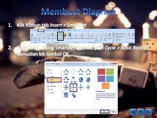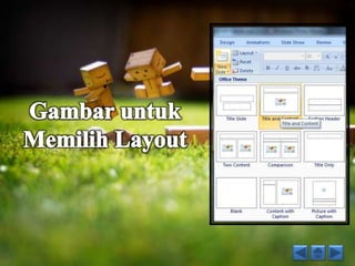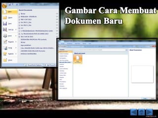Dokumen ini merupakan panduan lengkap mengenai penggunaan Microsoft PowerPoint 2007, mencakup pengenalan alat, cara membuat presentasi, menambahkan tabel, grafik, diagram, serta dasar-dasar animasi. Serta menjelaskan fungsi berbagai menu dan icon dalam perangkat lunak untuk memudahkan pembuatan presentasi yang menarik. Terdapat juga instruksi untuk mengatur slide dan fitur-fitur lainnya untuk meningkatkan kualitas presentasi.