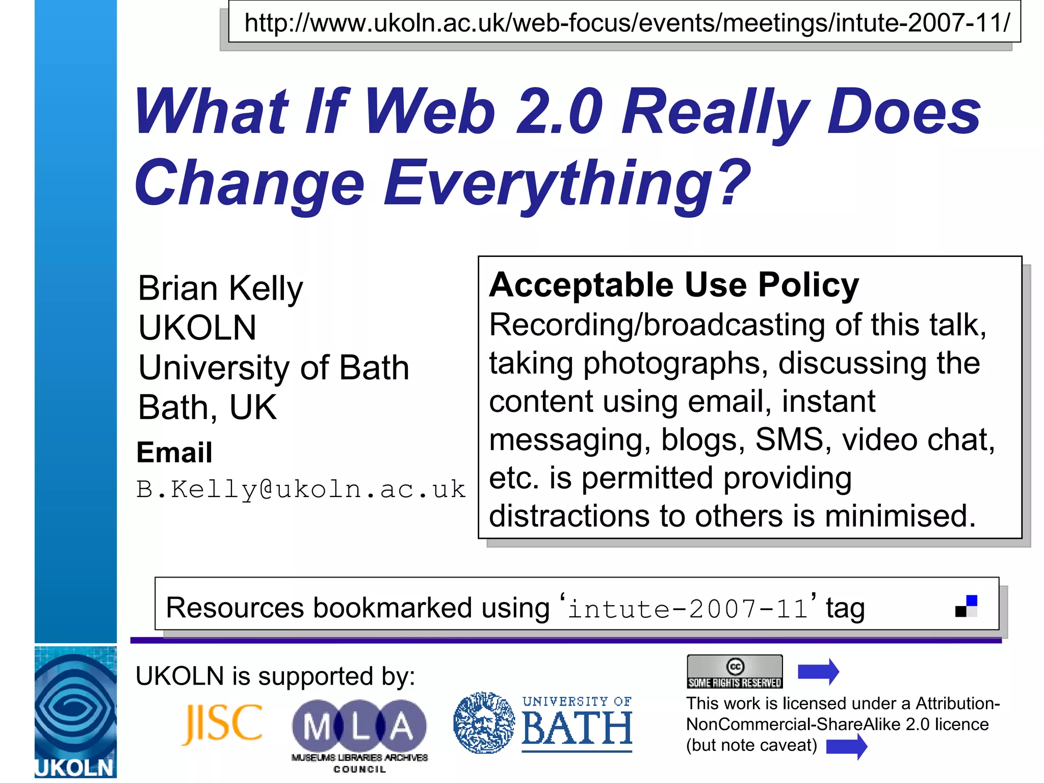 The document discusses how Web 2.0 technologies like blogs, wikis, RSS, and user-generated content have changed how people use and share information online. It argues that services like Intute were pioneers in these approaches before the term "Web 2.0" was coined. Looking ahead, it suggests institutions embrace new models where commercial services host content and applications, and find ways to enhance rather than compete with popular third-party sites.