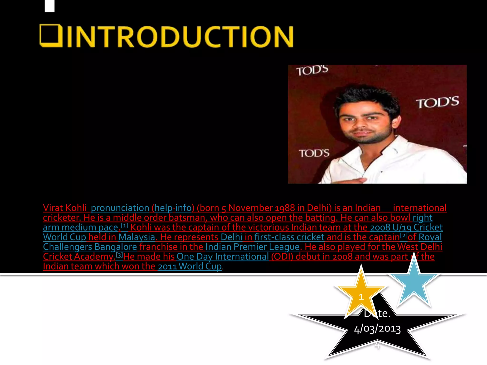 Virat Kohli is an Indian international cricketer who plays as a middle order batsman and can open the batting. He can also bowl right arm medium pace. Kohli captained India's victorious under-19 team in the 2008 World Cup. He plays domestic cricket for Delhi and captains the Royal Challengers Bangalore in the IPL. Kohli made his ODI debut in 2008 and was part of the 2011 World Cup winning Indian team.