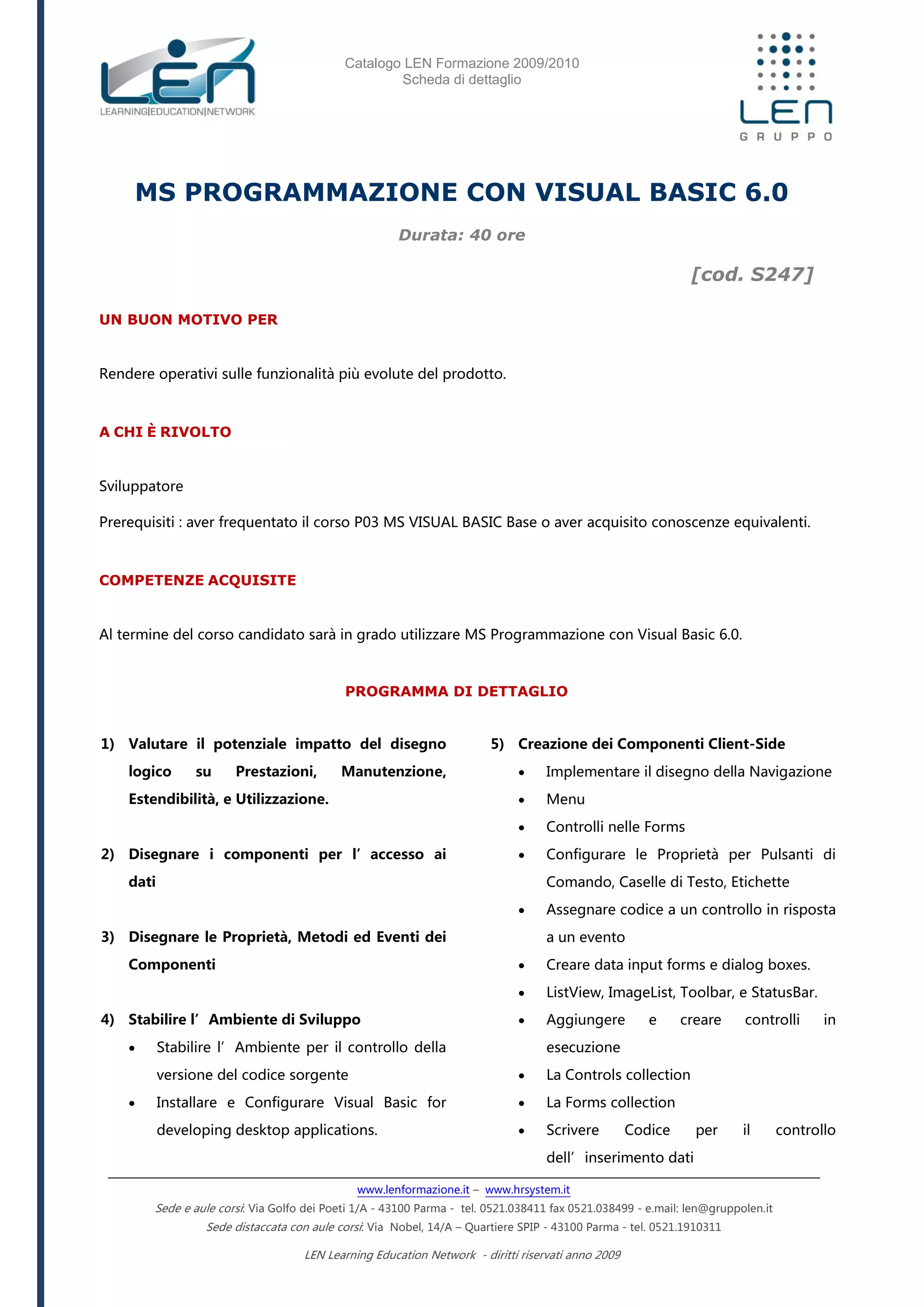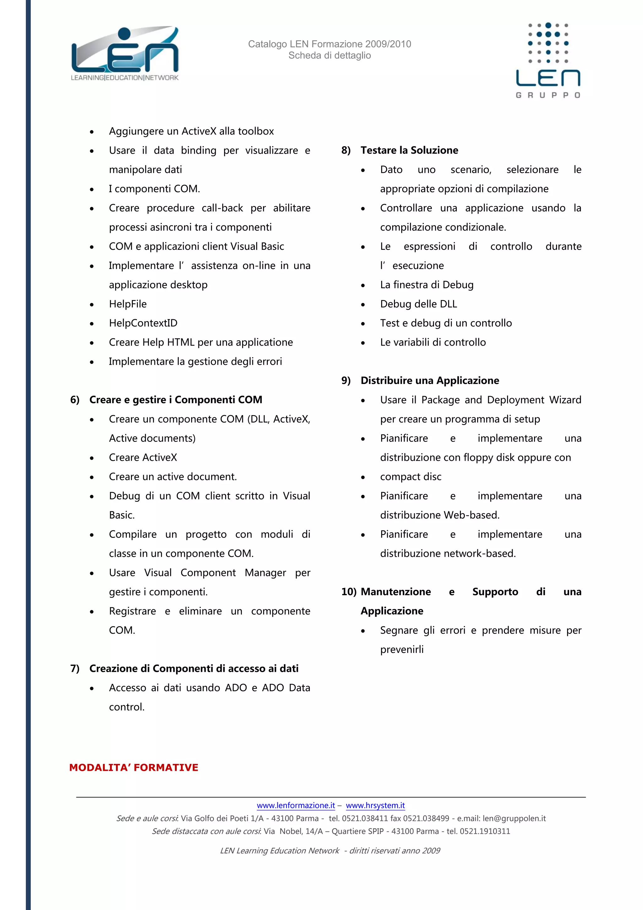 Il documento descrive il corso di programmazione con Visual Basic 6.0 offerto da LEN per l'anno formativo 2009/2010, dedicato a sviluppatori con prerequisiti specifici. Al termine del corso, i partecipanti acquisiranno competenze avanzate nella creazione di componenti, nella gestione dei dati e nella distribuzione applicativa. Inoltre, vengono presentate diverse modalità formative, tra cui seminari e workshop, con durata variabile.