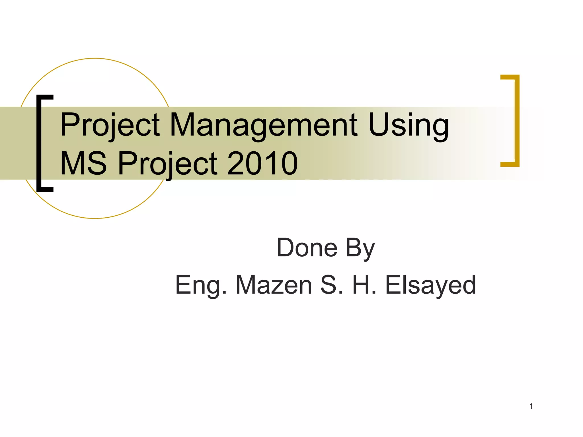 The document provides an overview of project management using MS Project 2010. It discusses starting a project and identifying the main parts of the Project window. It also covers exploring different MS Project views and reports. The document outlines setting up a project plan, including defining working and non-working time and other properties. It then summarizes chapters on creating a task list, setting up resources, and assigning resources to tasks. Key points include estimating task durations, creating milestones and task relationships, documenting tasks, and controlling how resources are scheduled.