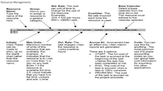 Microsoft Project is a project management software developed by Microsoft to help project managers develop plans, assign resources to tasks, track progress, manage budgets, and analyze workloads. It was initially created as an internal tool at Microsoft to manage software projects. Key features include creating schedules using Gantt charts, assigning resources to tasks, tracking progress against a baseline, and analyzing critical paths and time-cost tradeoffs like crashing. Project managers use MS Project to plan by defining goals, developing tasks, establishing timeframes, organizing resources, and setting up the overall project structure and schedule.