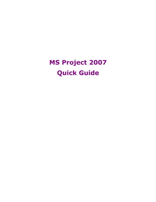This document provides instructions for using MS Project 2007 to plan and manage projects. It outlines how to set up the project by adding information, determining start dates, and configuring calendars and settings. It describes how to create a work breakdown structure by adding tasks, dependencies, durations, resources and assigning them. It also covers tracking progress by saving baselines, entering actuals, and evaluating. Finally, it discusses communicating the project plan through printing, screenshots, reports and exporting to Excel.