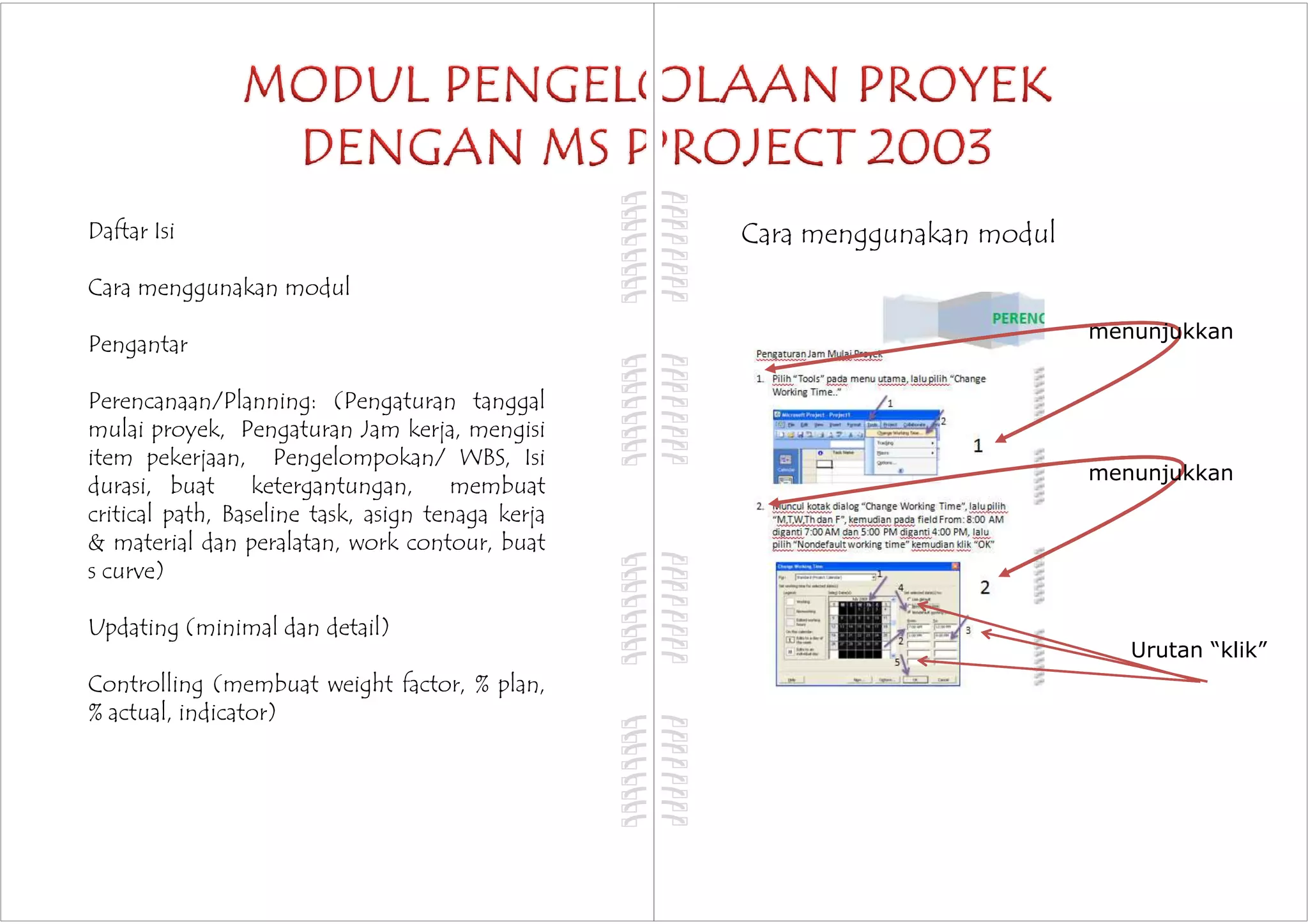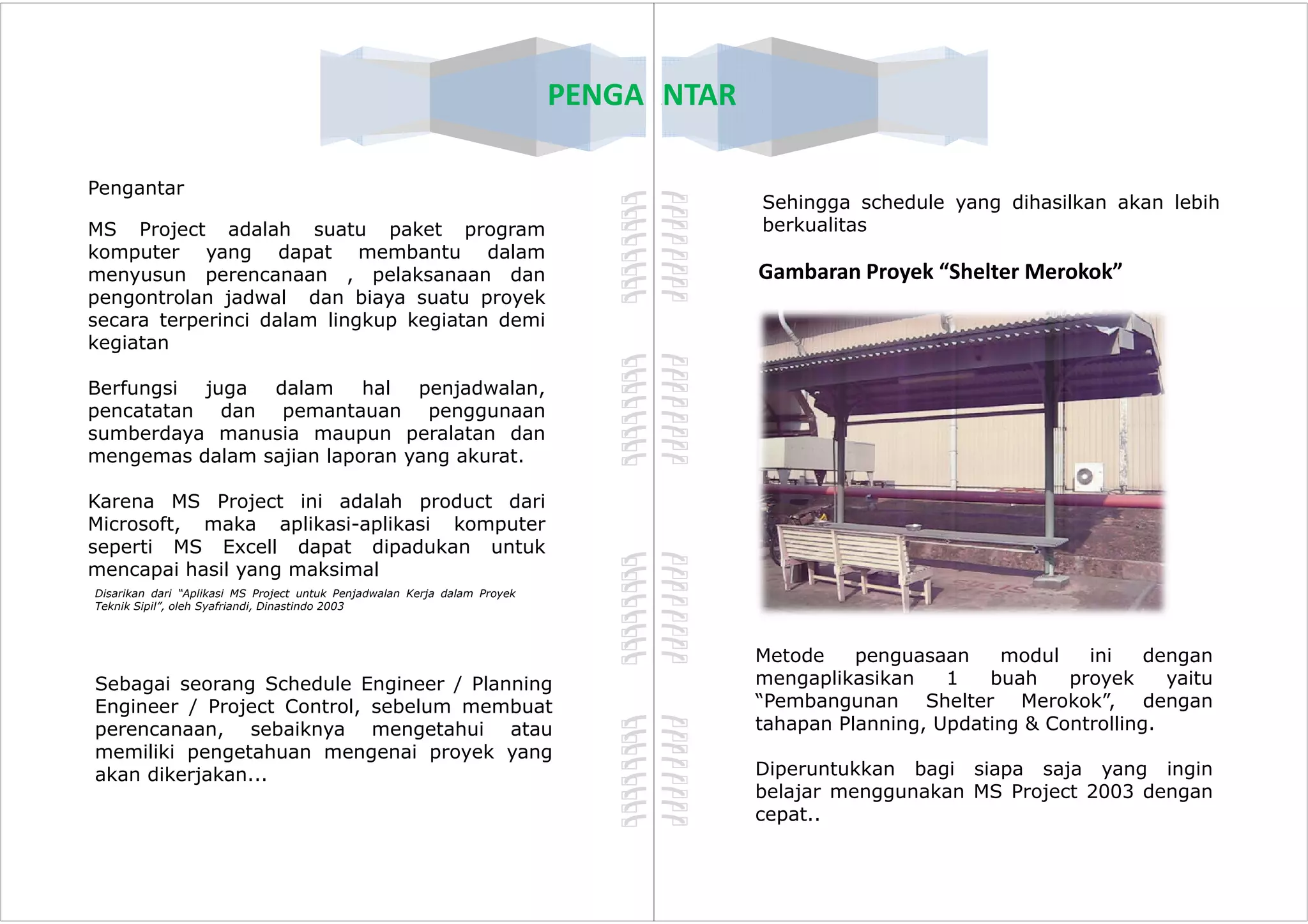 MS Project digunakan untuk merencanakan, melaksanakan, dan mengontrol jadwal dan biaya proyek secara terperinci. Modul ini mendemonstrasikan cara menggunakan MS Project untuk merencanakan proyek pembangunan shelter merokok, meliputi pengaturan, pengisian item pekerjaan, pengelompokan, pengisian durasi, pembuatan hubungan antar item, penugasan sumber daya, dan pembuatan kurva S.