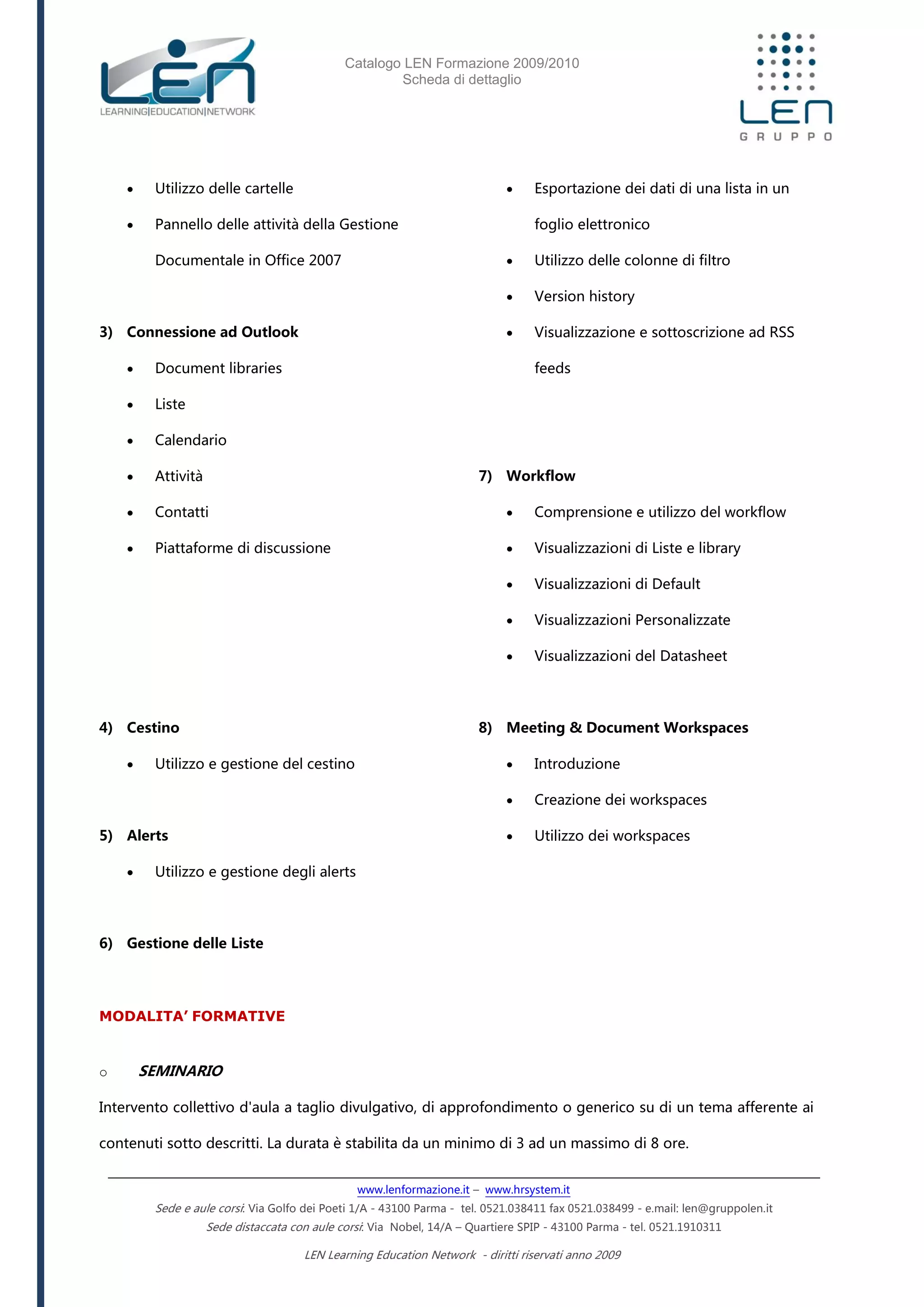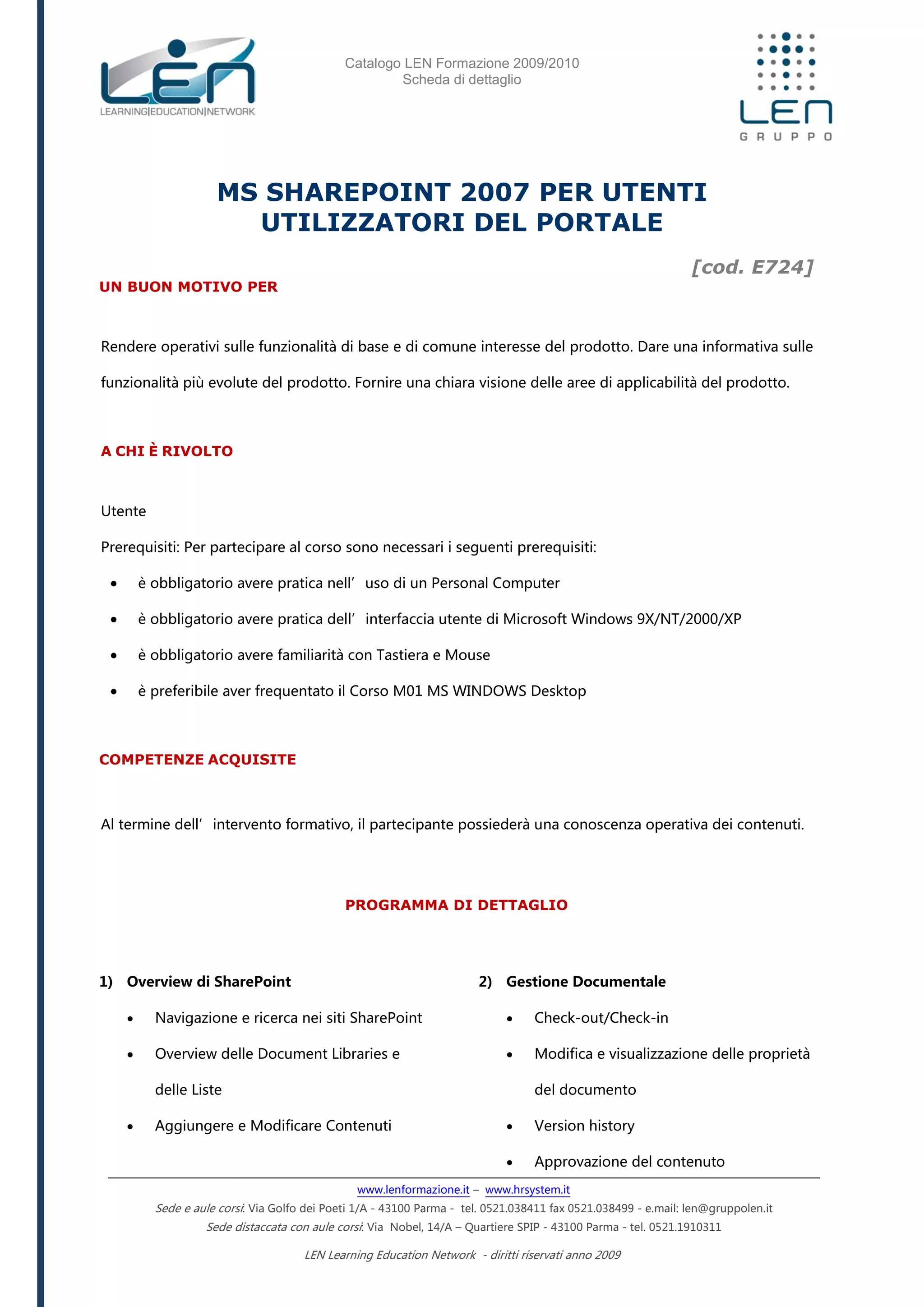 Il documento presenta il catalogo del corso di formazione 2009/2010 dell'LEN Learning Education Network, con dettagli sui corsi offerti per l'utilizzo di SharePoint 2007. I requisiti per la partecipazione includono familiarità con l'uso di computer e Microsoft Windows, e i corsi coprono argomenti dalla gestione documentale all'integrazione con Outlook. Le modalità formative comprendono seminari, workshop e corsi di training, con durate variabili a seconda degli obiettivi formativi.