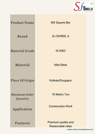 The document details the specifications and applications of mild steel (m.s.) square bars, including various grades, dimensions, and weights. These square bars are utilized in engineering components, forging industries, grill fencing, and construction work, emphasizing their robust quality and long lifespan. Additionally, it provides detailed size and weight charts, tolerance levels, and chemical and mechanical composition standards.
