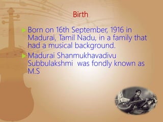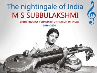 M.S. Subbulakshmi was a renowned Indian carnatic musician and playback singer who was born in 1916 in Madurai, India. She was a child prodigy, beginning her career in music at age 8 and releasing her first recording at age 10. Throughout her life, she received extensive classical training in both carnatic and hindustani styles of music and had a hugely successful career, performing internationally and receiving many prestigious national awards, including the Bharat Ratna. She was considered a living legend and was beloved for popularizing Indian classical music around the world until her death in 2004 at age 88.